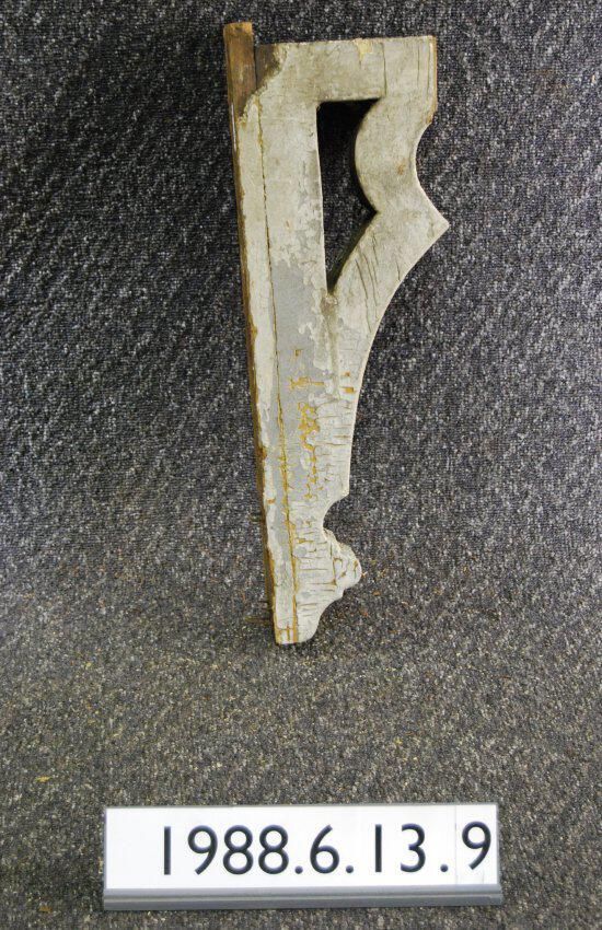 Wood bracket. Upper front end is truncated. Sides have compound curved profile. Cut out center. Portion of front is reeded. Painted grey. Inscriptions or Markings: Manufacturer: Place of Manufacturer: Design motif: Style: Finish: Painted