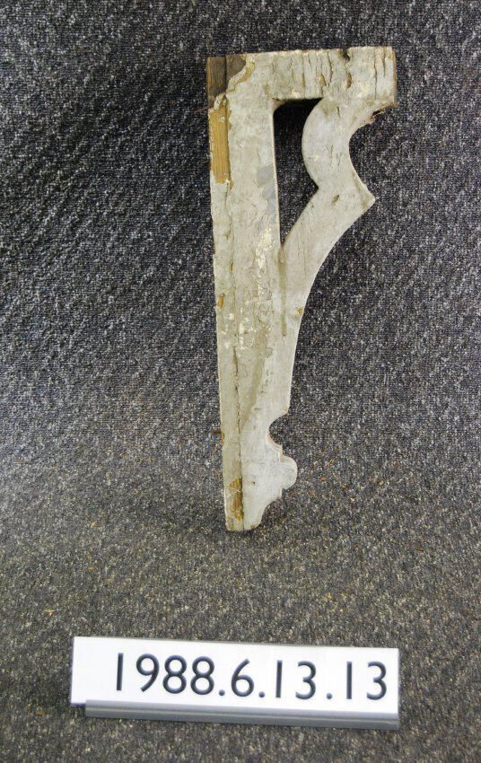 Wood bracket. Upper front end is truncated. Sides have compound curved profile. Cut out center. Portion of front is reeded Painted grey. Inscriptions or Markings: Manufacturer: Place of Manufacturer: Design motif: Style: Finish: Painted