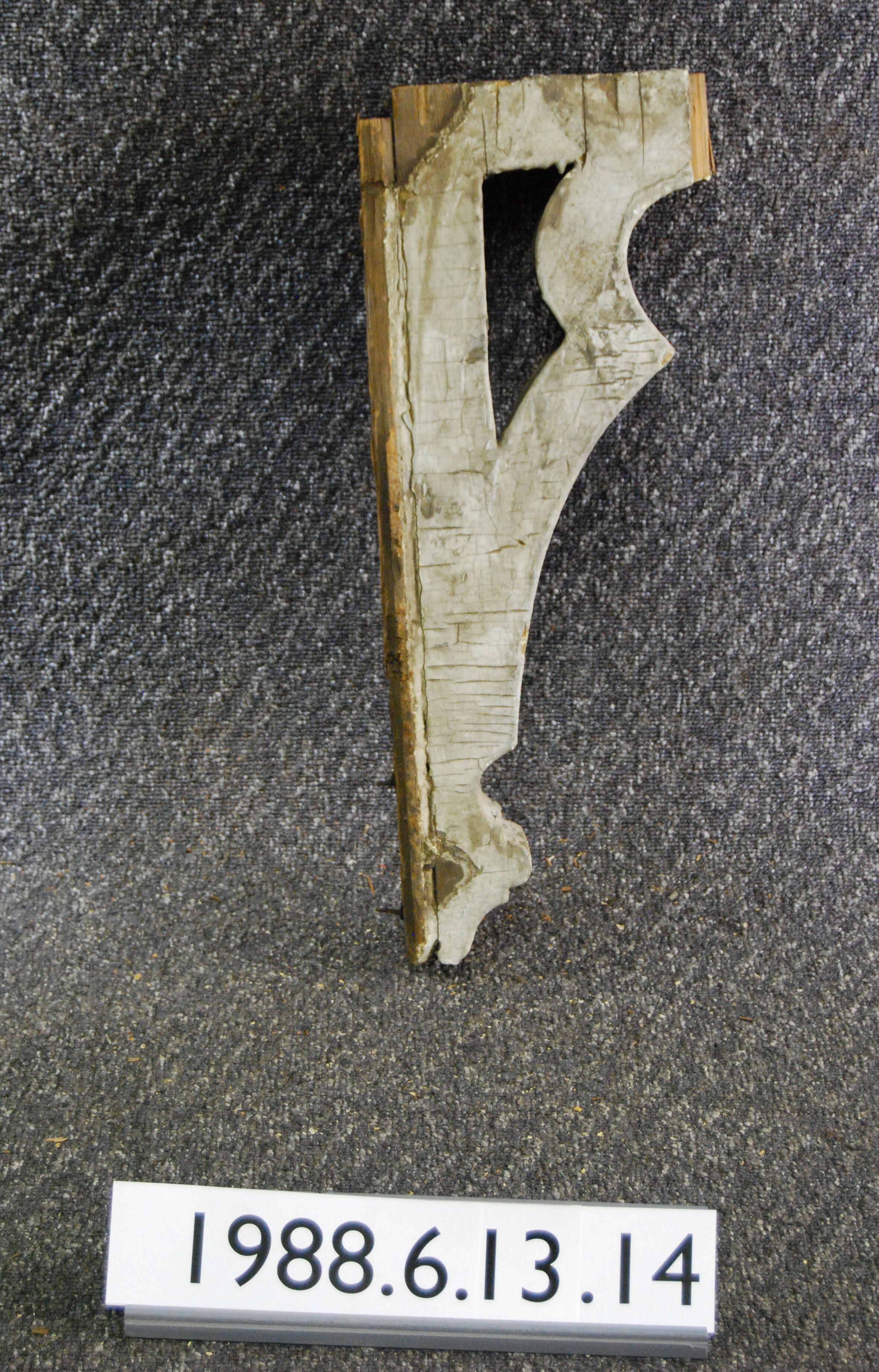 Wood bracket. Upper front end is truncated. Sides have compound curved profile. Cut out center. Portion of front is reeded. Painted grey. Inscriptions or Markings: Manufacturer: Place of Manufacturer: Design motif: Style: Finish: Painted