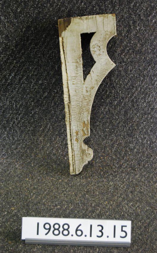 Wood bracket. Upper front end is truncated. Sides have compound curved profile. Cut out center. Portion of front is reeded. Painted grey. Inscriptions or Markings: Manufacturer: Place of Manufacturer: Design motif: Style: Finish: Painted