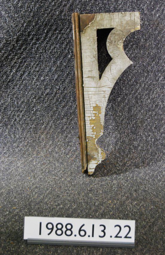 Wood bracket. Upper front end is truncated. Sides have compound curved profile. Cut out center. Portion of front is reeded. Painted grey. Inscriptions or Markings: Manufacturer: Place of Manufacturer: Design motif: Style: Finish: Painted