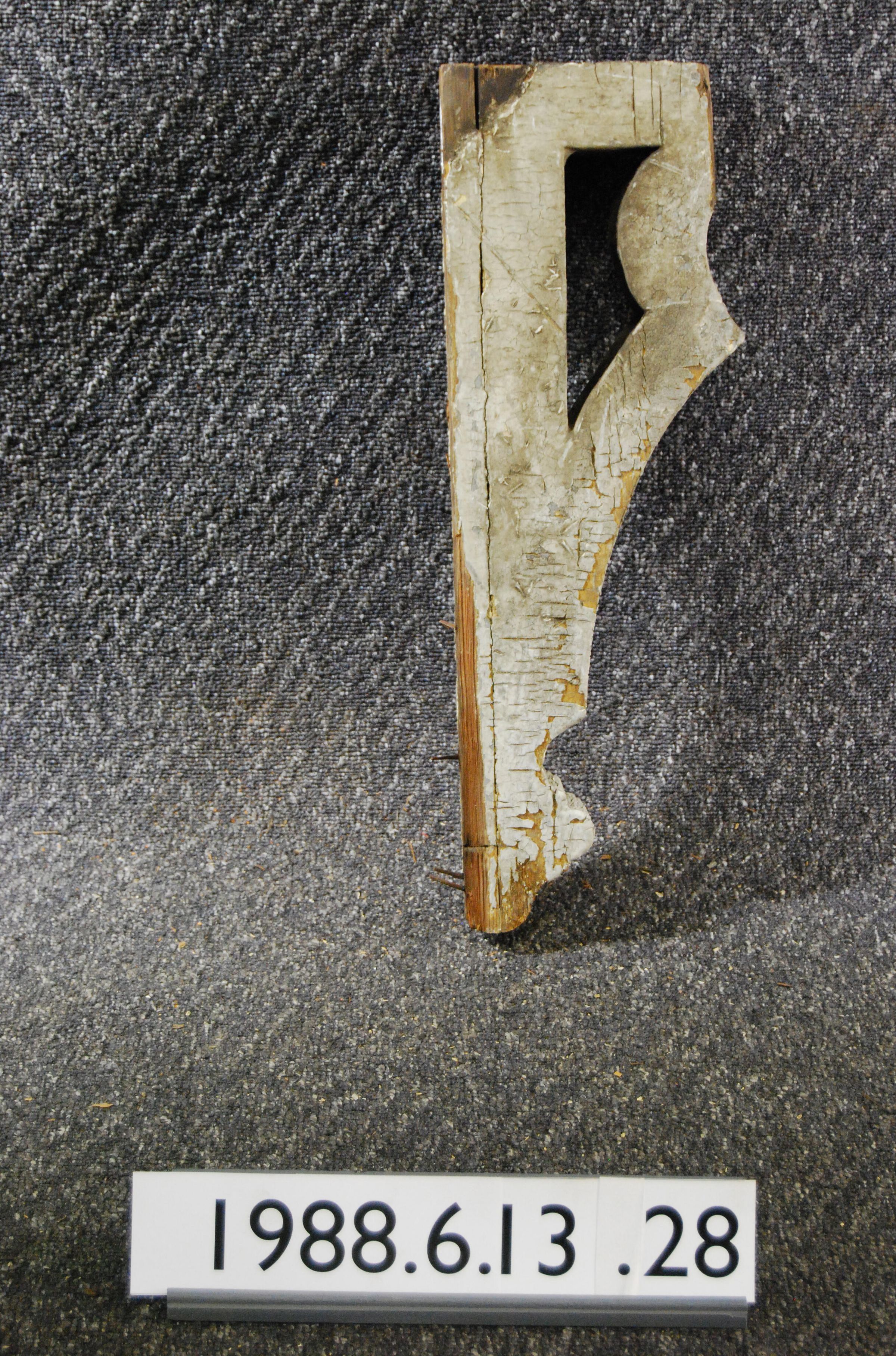 Wood bracket. Upper front end is truncated. Sides have compound curved profile. Cut out center. Portion of front is reeded. Painted grey. Inscriptions or Markings: Manufacturer: Place of Manufacturer: Design motif: Style: Finish: Painted