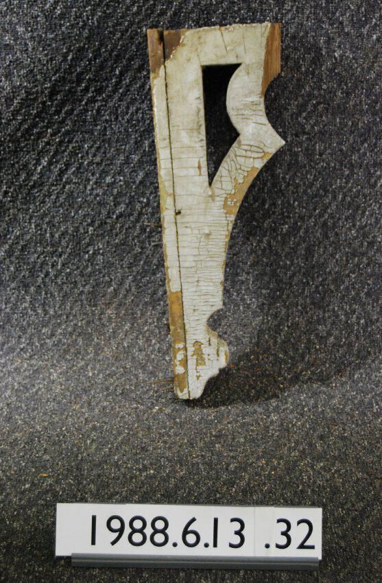 Wood bracket. Upper front end is truncated. Sides have compound curved profile. Cut out center. Portion of front is reeded. Painted grey. Inscriptions or Markings: Manufacturer: Place of Manufacturer: Design motif: Style: Finish: Painted