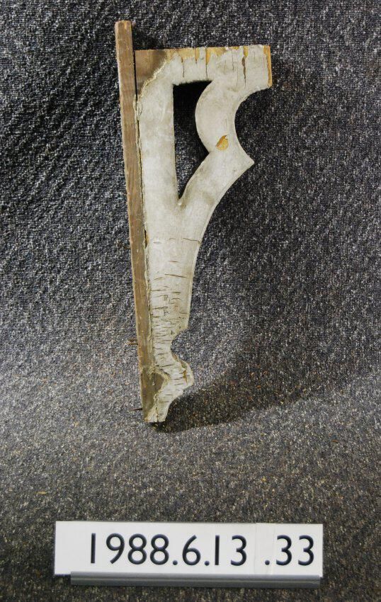 Wood bracket. Upper front end is truncated. Sides have compound curved profile. Cut out center. Portion of front is reeded. Painted grey. Inscriptions or Markings: Manufacturer: Place of Manufacturer: Design motif: Style: Finish: Painted
