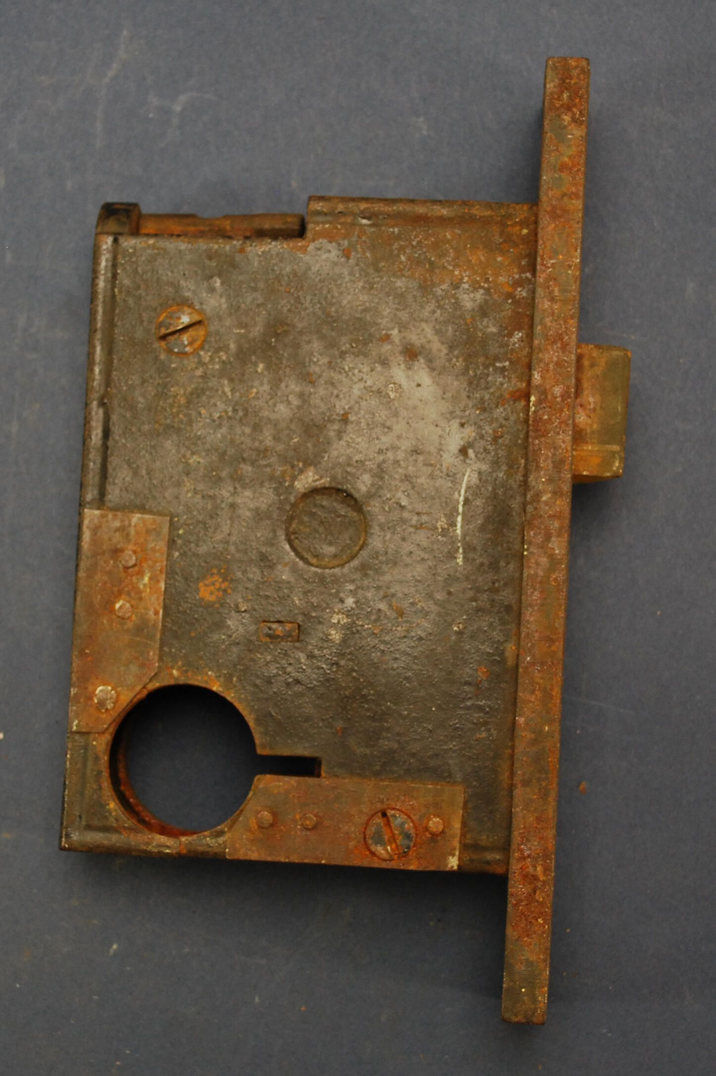 Comments: Entrance lock for use with cylinder lock, cylinder is missing. Case cover broken and repaired with steel patches.