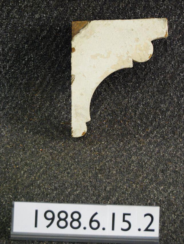 Wood bracket. Plain sides with compound contour. Fluting on front. Painted white. Inscriptions or Markings: Manufacturer: Place of Manufacturer: Design motif: Style: Finish: Painted