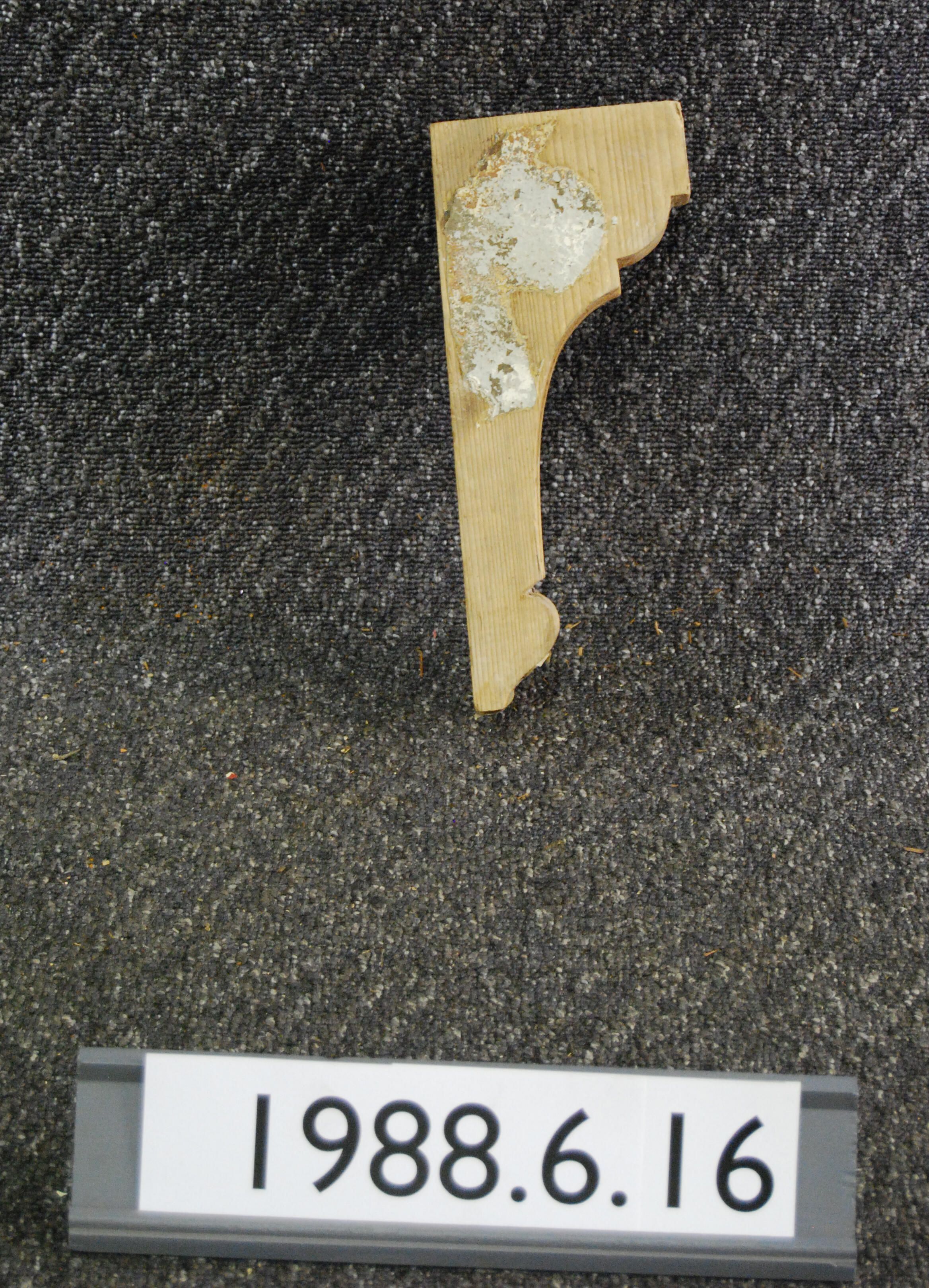 Wood bracket. Plain sides with compound contour. Fluting on front. Partially stripped with remnants of grey paint. Inscriptions or Markings: Manufacturer: Place of Manufacturer: Design motif: Style: Finish: Painted