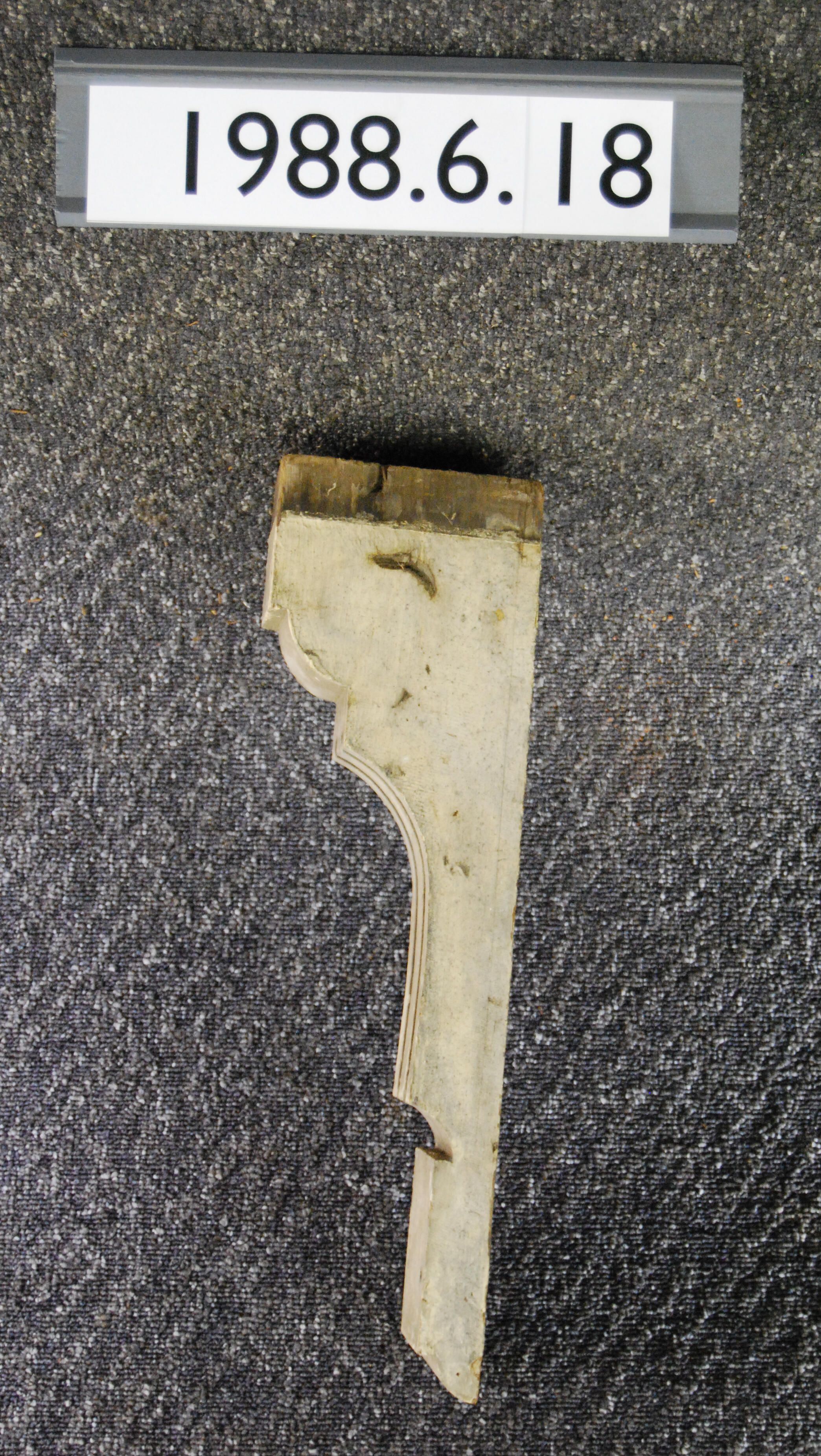 Wood bracket. Plain sides. Compound contour. Fluted front. Painted yellow / off white. Inscriptions or Markings: Manufacturer: Place of Manufacturer: Design motif: Style: Finish: Painted