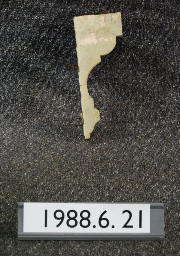 Wood bracket. Plain sides. Compound contour. Fluted front. Painted beige. Inscriptions or Markings: Manufacturer: Place of Manufacturer: Design motif: Style: Finish: Painted