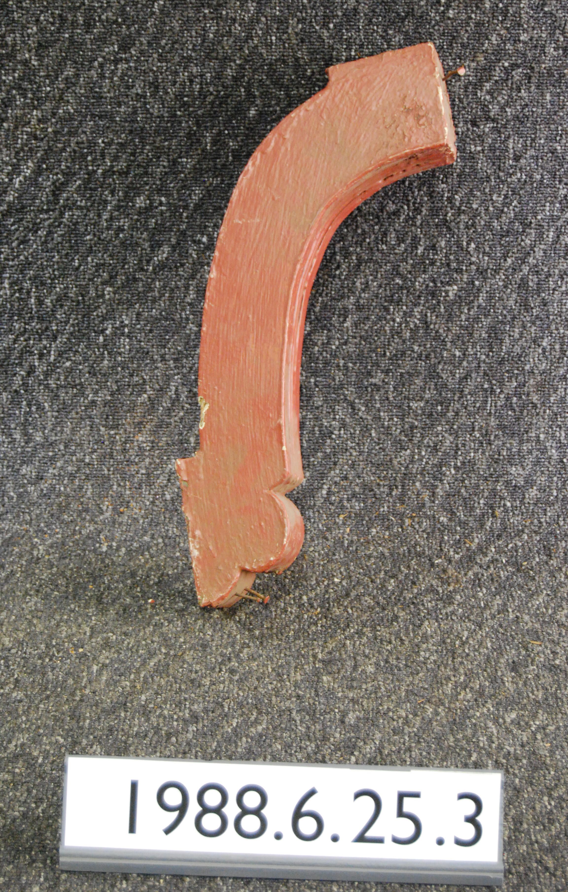 Wood bracket. Plain sides. Contoured at front and back. Fluted front. Painted red. Inscriptions or Markings: Manufacturer: Place of Manufacturer: Design motif: Style: Finish: Painted