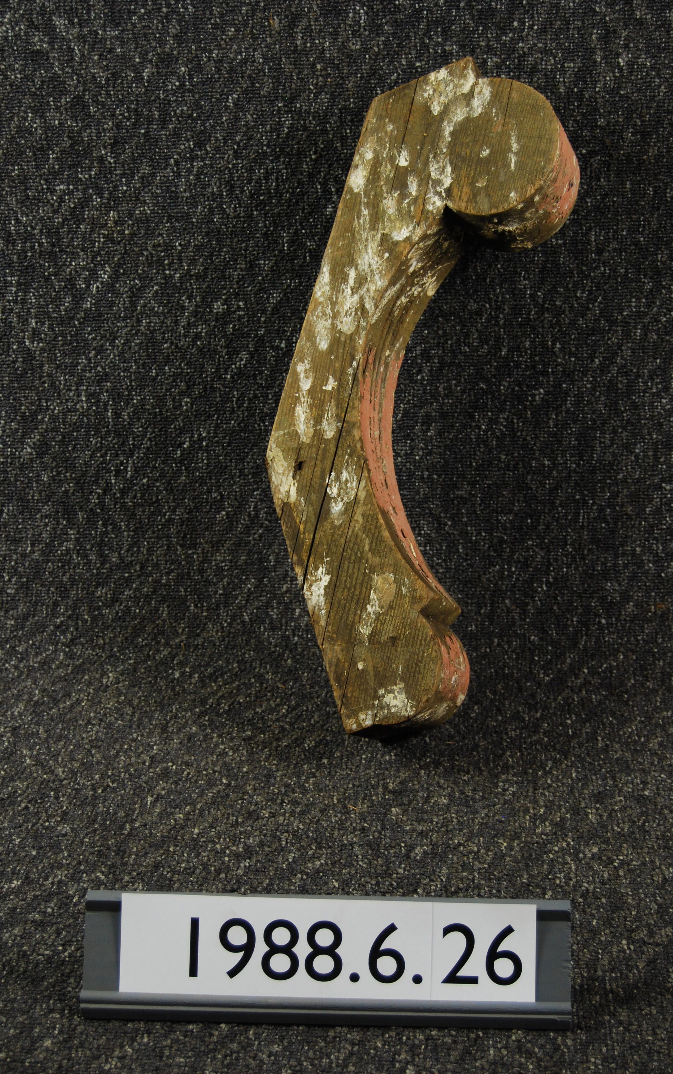 Wood bracket. Plain sides. Compound countour. Fluted front. Painted red. Inscriptions or Markings: Manufacturer: Place of Manufacturer: Design motif: Style: Finish: Painted