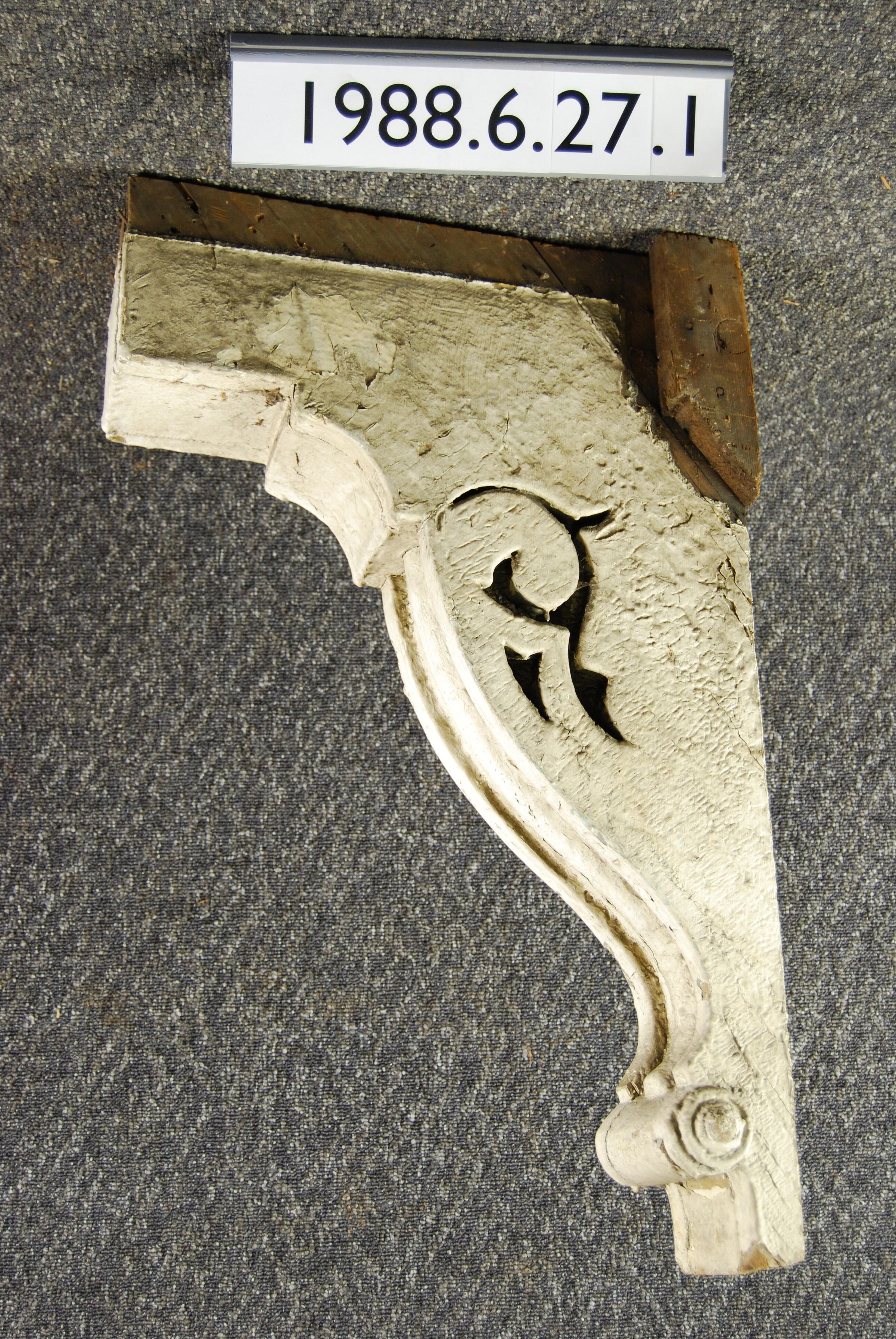 Wood cornice bracket. Scrolled sides. Fluted front. Painted white. Inscriptions or Markings: Manufacturer: Place of Manufacturer: Design motif: Style: Finish: Painted