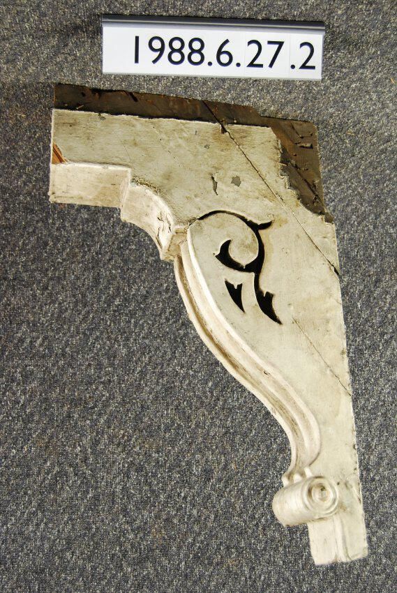 Wood cornice bracket. Scrolled sides. Fluted front. Painted white. Inscriptions or Markings: Manufacturer: Place of Manufacturer: Design motif: Style: Finish: Painted