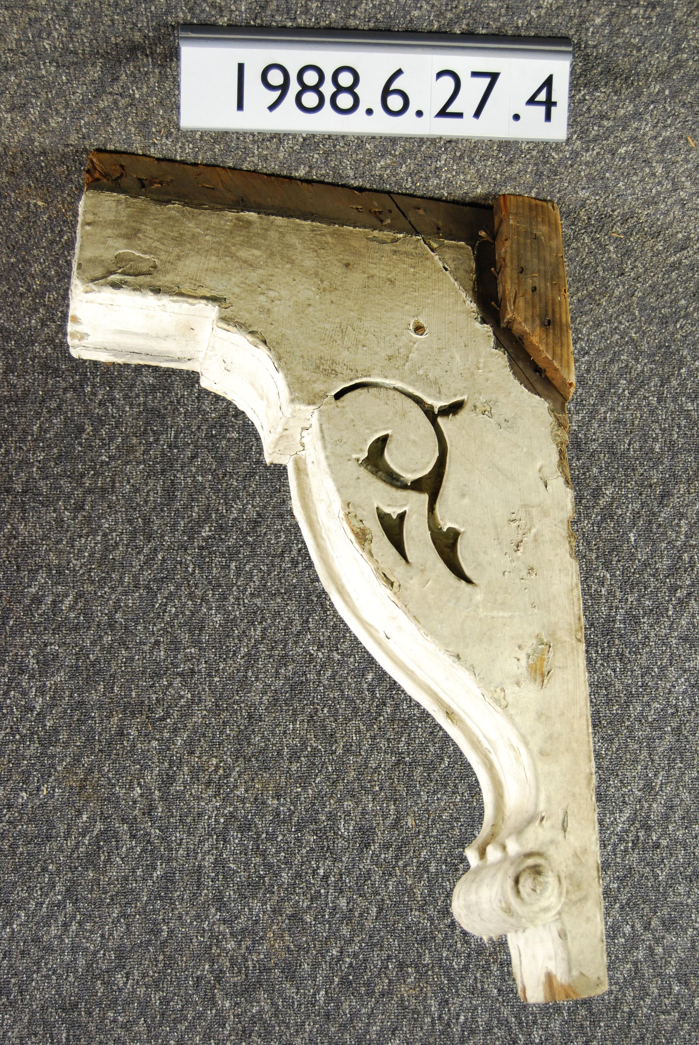 Wood cornice bracket. Scrolled sides. Fluted front. Painted white. Inscriptions or Markings: Manufacturer: Place of Manufacturer: Design motif: Style: Finish: Painted