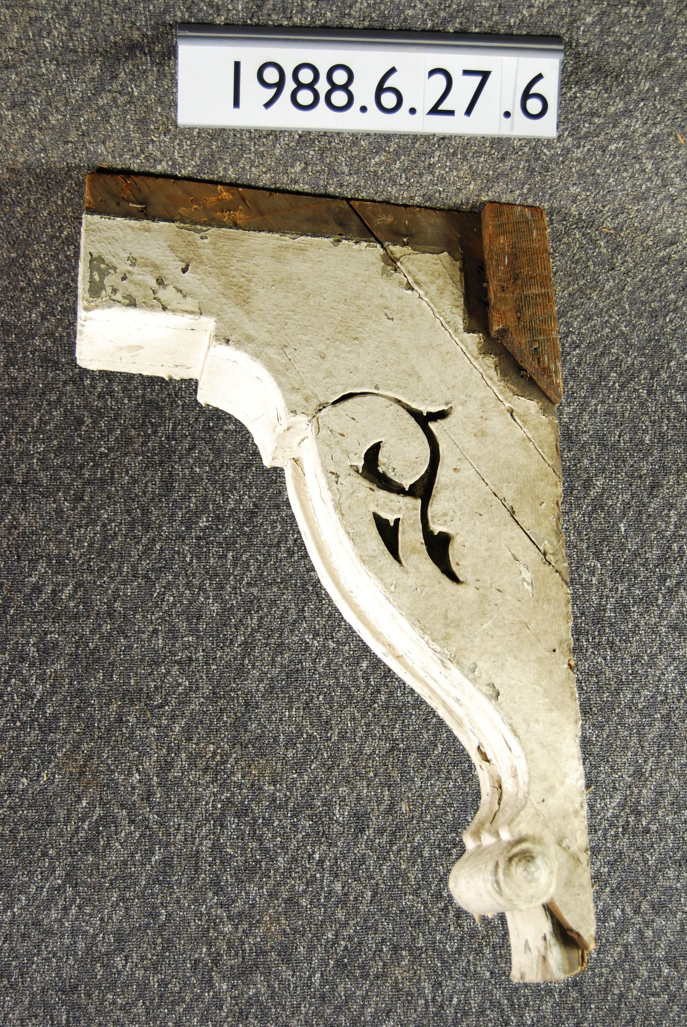 Wood cornice bracket. Scrolled sides. Fluted front. Painted white. Inscriptions or Markings: Manufacturer: Place of Manufacturer: Design motif: Style: Finish: Painted