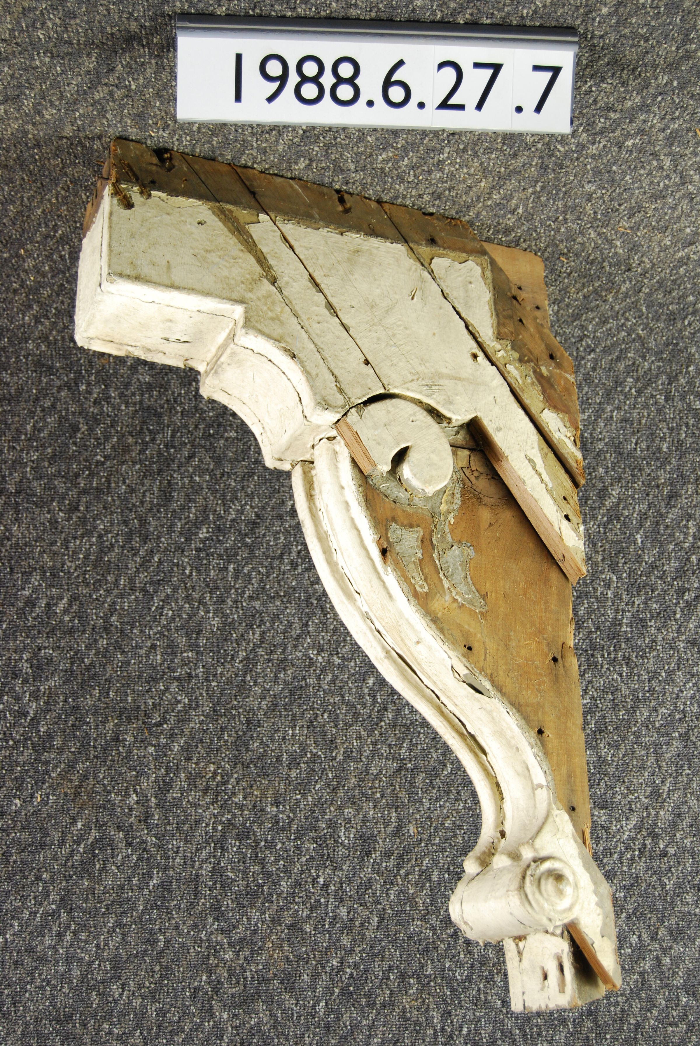 Wood cornice bracket. Scrolled sides. Parts missing on both sides. Fluted front. Painted white. Inscriptions or Markings: Manufacturer: Place of Manufacturer: Design motif: Style: Finish: Painted