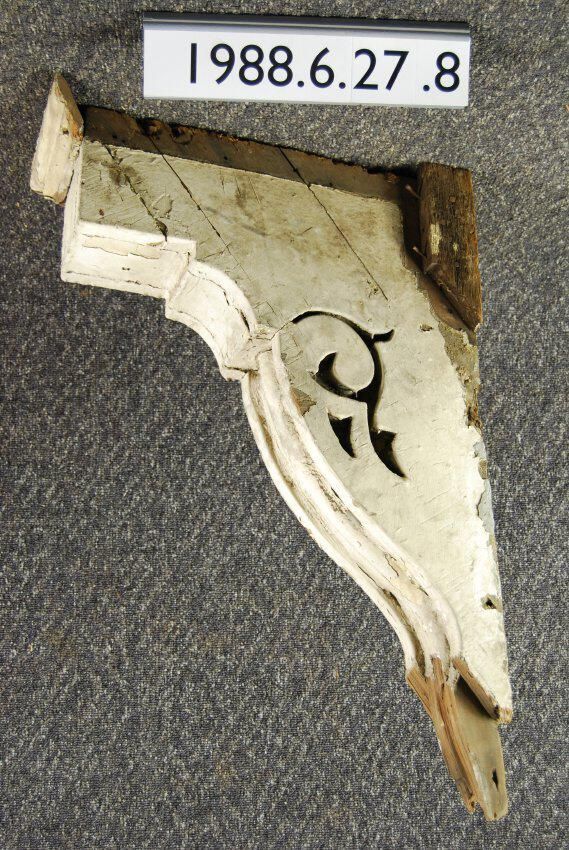 Wood cornice bracket. Scrolled sides. Fluted front. Incomplete moldings at top. Bottom of bracket is missing. Inscriptions or Markings: Manufacturer: Place of Manufacturer: Design motif: Style: Finish: Painted
