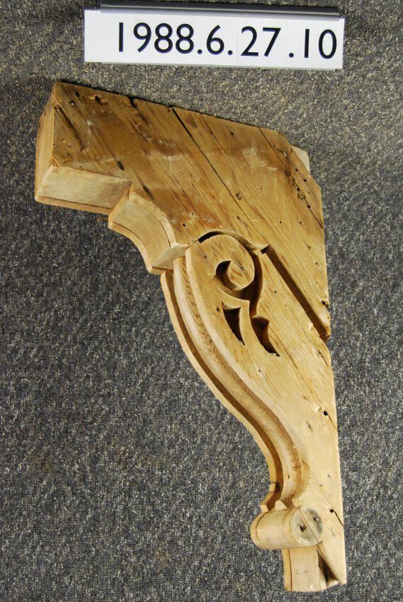 Wood cornice bracket. Scrolled sides. Fluted front. Stripped of paint. Inscriptions or Markings: Manufacturer: Place of Manufacturer: Design motif: Style: Finish: Stripped
