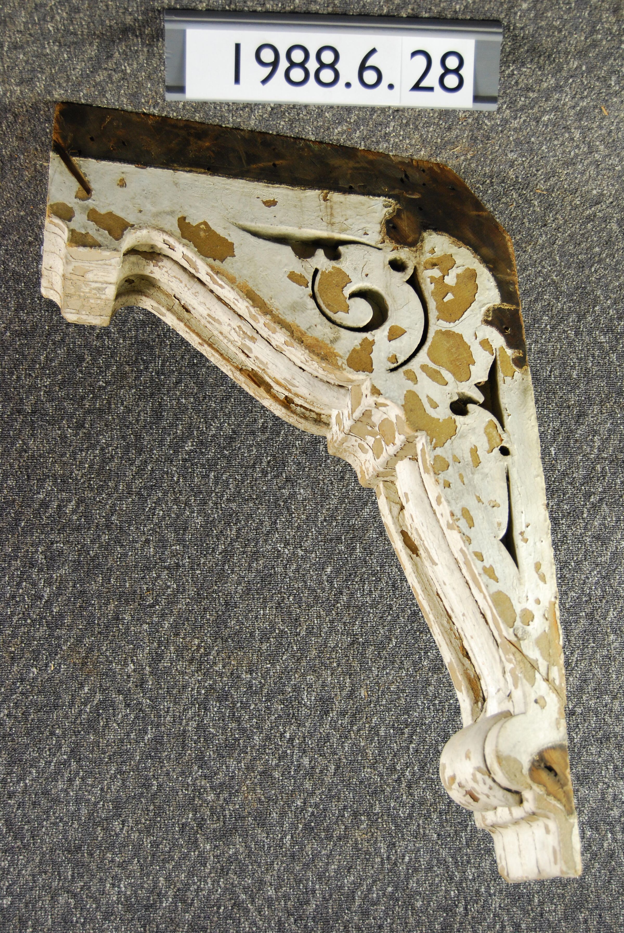 Wood cornice bracket. Scrolled sides. Fluted front. Painted white.. Inscriptions or Markings: Manufacturer: Place of Manufacturer: Design motif: Style: Finish: Painted