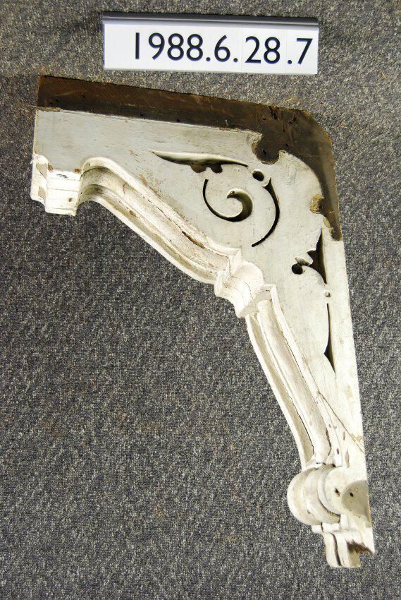 Wood cornice bracket. Scrolled sides. Fluted front. Missing pieces at bottom Broken body. Painted white.. Inscriptions or Markings: Manufacturer: Place of Manufacturer: Design motif: Style: Finish: Painted