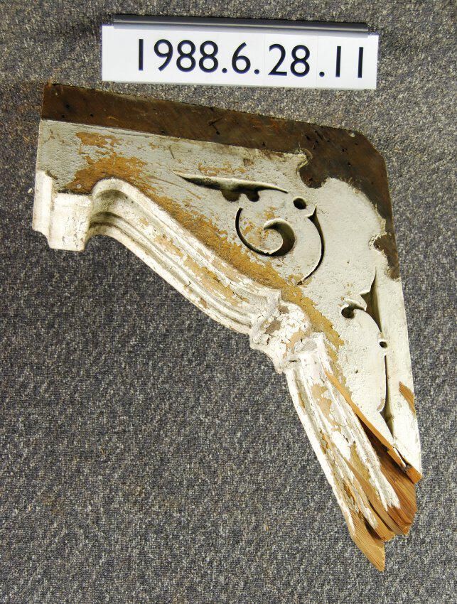 Wood cornice bracket. Scrolled sides. Fluted front. Lower end is missing Painted white.. Inscriptions or Markings: Manufacturer: Place of Manufacturer: Design motif: Style: Finish: Painted
