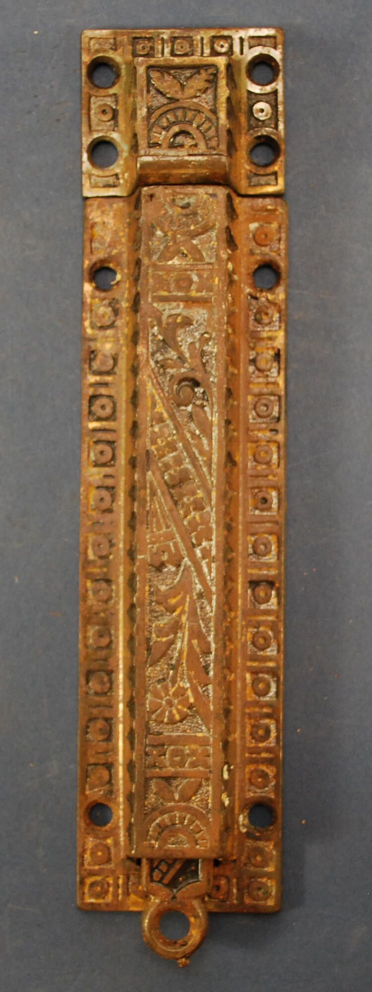 Design Name: Manufacturer: Unknown Style: Aesthetic Material: Iron Manufacturing Method: Cast Surface Finish: Japanned / Plated VDA Classification: VDA Number: Shape: Patent Specifics: Lock Type (If Applicable): Inscription/Makers Mark: Inscription Text: Comments: Includes strike plate, chain is missing.