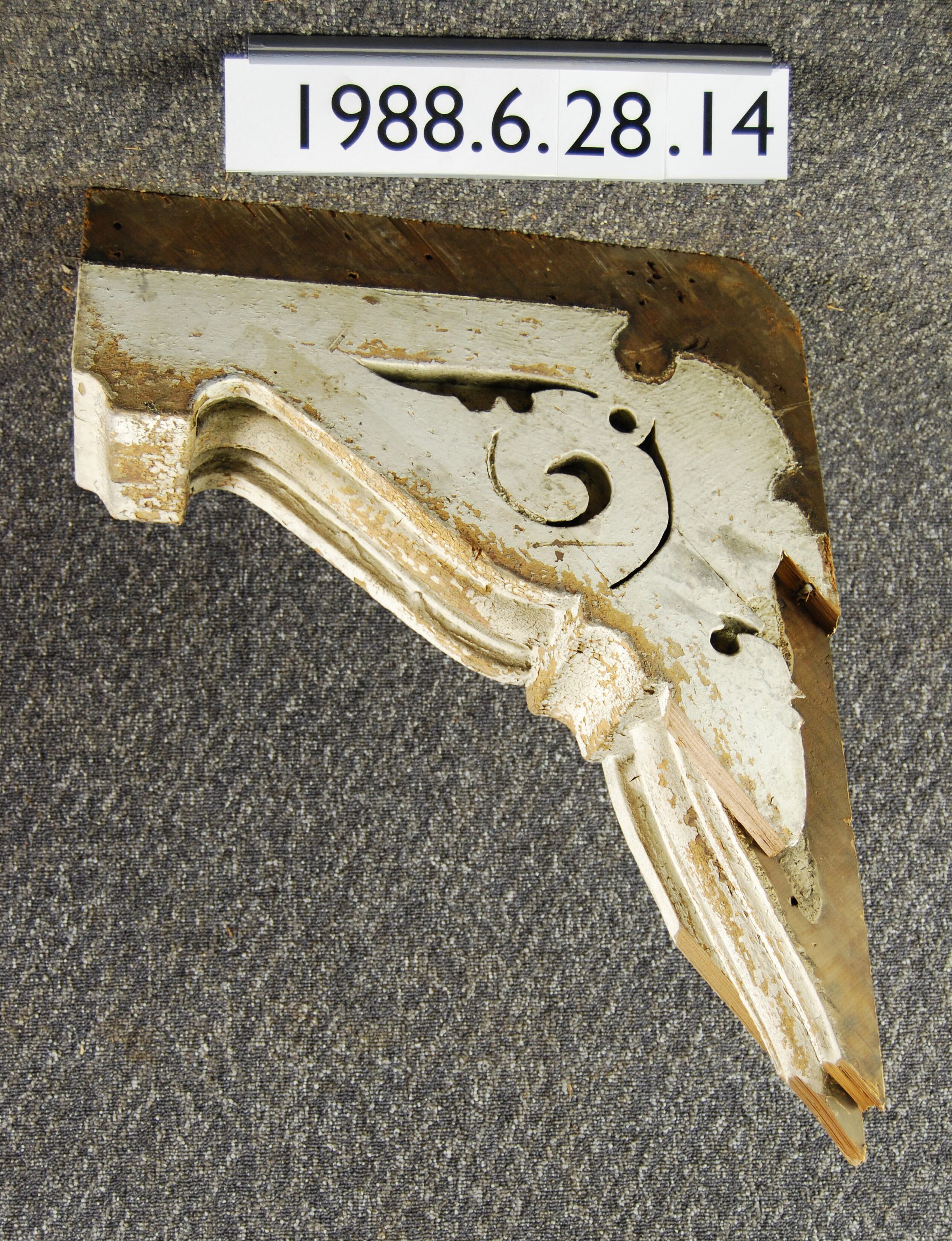 Wood cornice bracket. Scrolled sides. Fluted front. Lower end is missing Painted white.. Inscriptions or Markings: Manufacturer: Place of Manufacturer: Design motif: Style: Finish: Painted