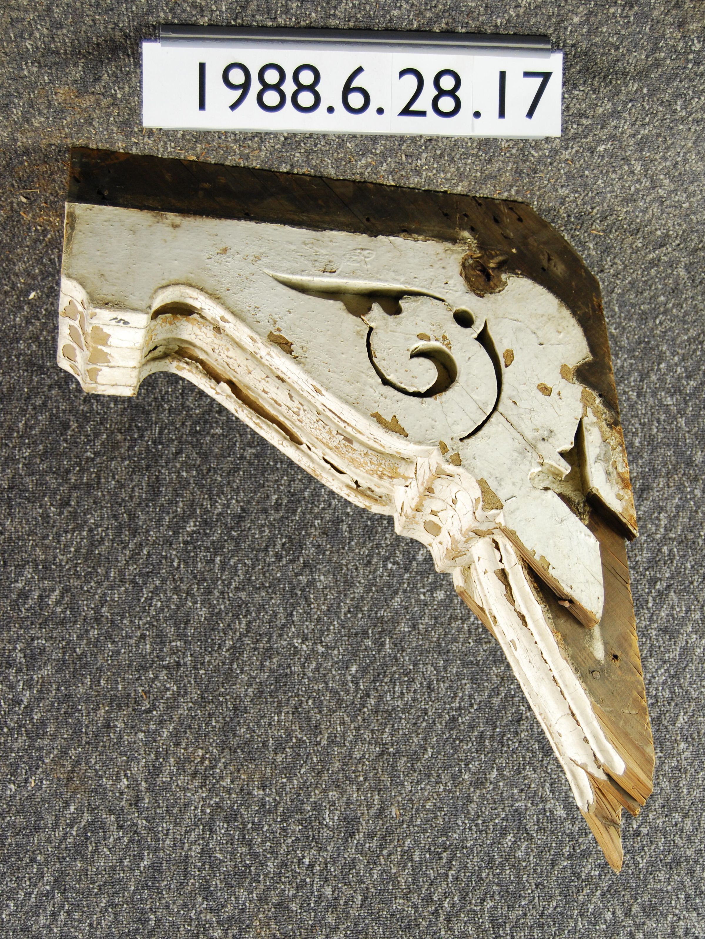 Wood cornice bracket. Scrolled sides. Fluted front. Lower end and piece at side are missing Painted white.. Inscriptions or Markings: Manufacturer: Place of Manufacturer: Design motif: Style: Finish: Painted