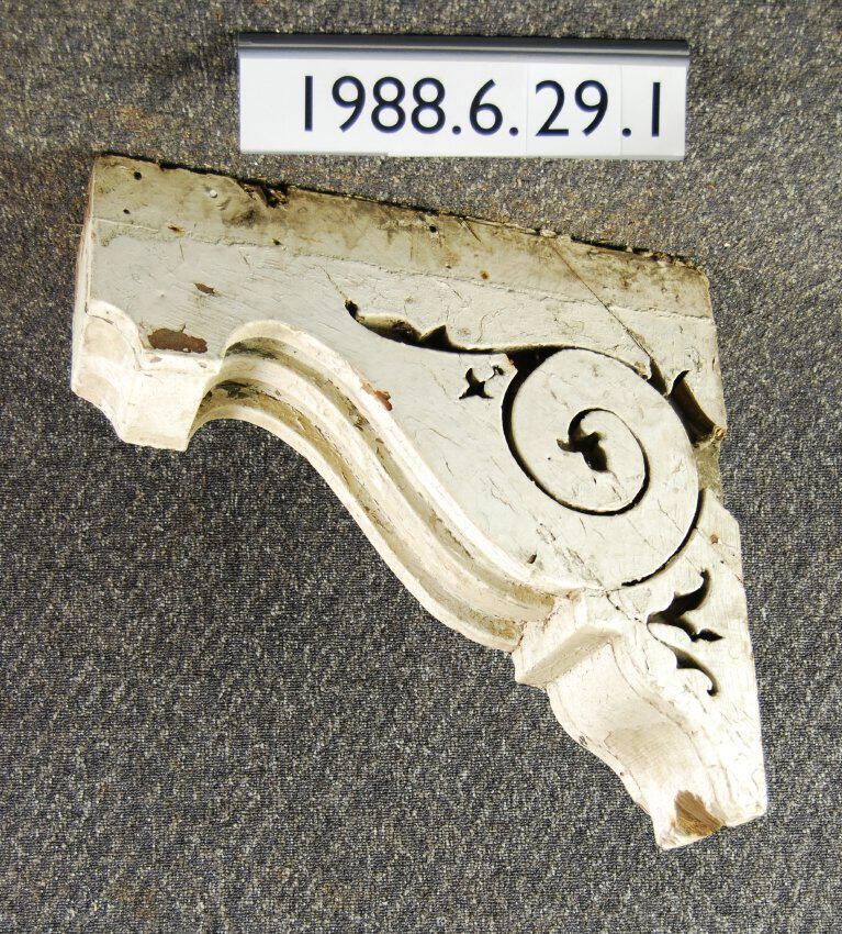 Wood cornice bracket. Scrolled sides. Fluted front. Painted white.. Inscriptions or Markings: Manufacturer: Place of Manufacturer: Design motif: Style: Finish: Painted