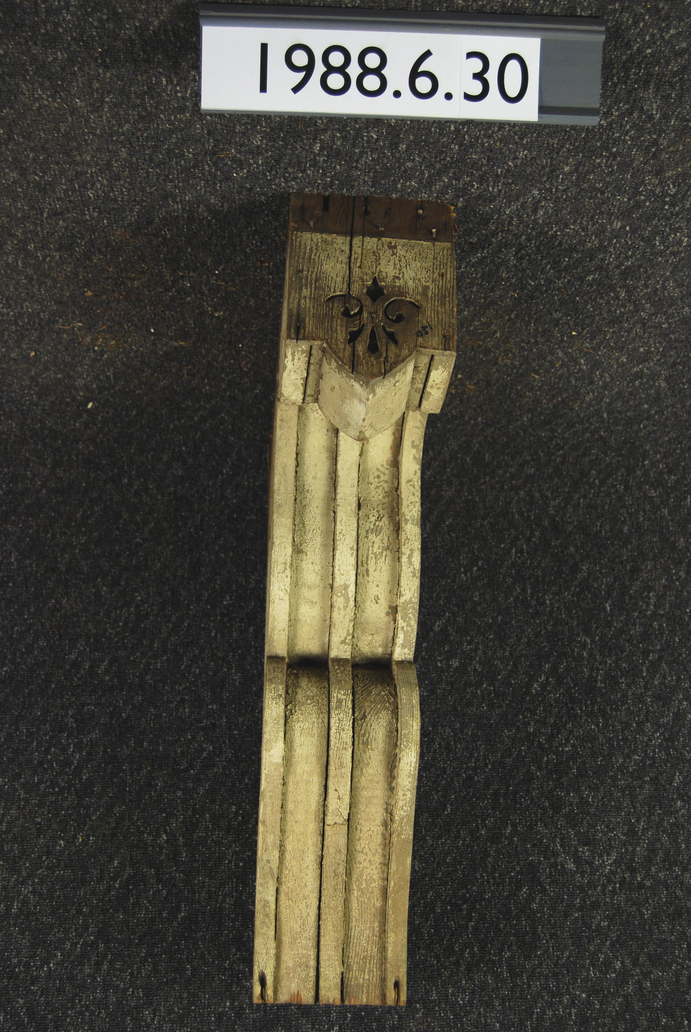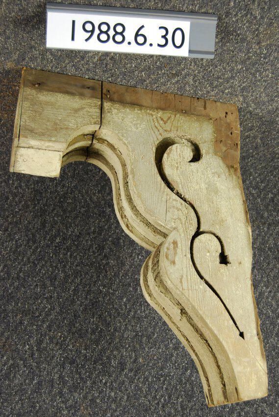 Wood cornice bracket. Scrolled sides. Fluted front. Incised ornament at top front. Painted white. Evidence of (past?) ponder post beetle damage. Inscriptions or Markings: Manufacturer: Place of Manufacturer: Design motif: Style: Finish: Painted