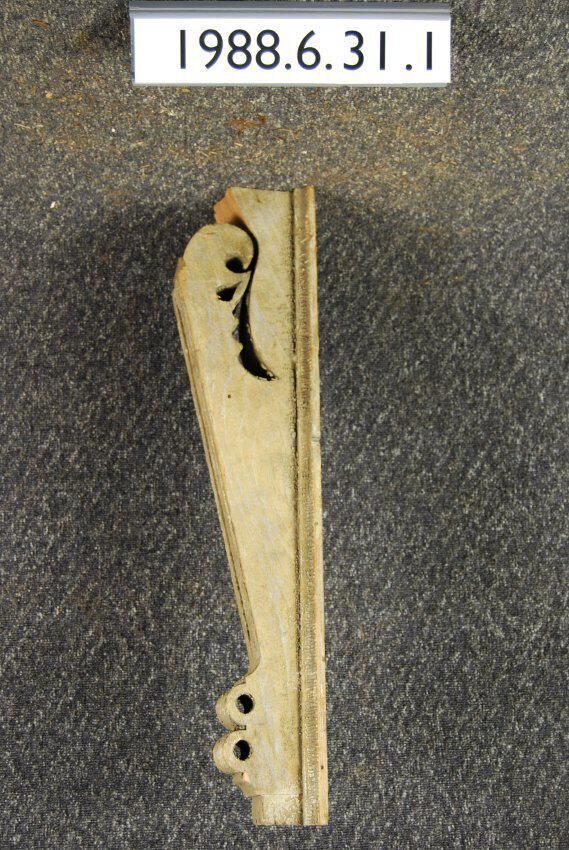Wood bracket. Scrolled sides. Fluted front. Bottom end has two circular hole ornaments. Painted beige. Inscriptions or Markings: Manufacturer: Place of Manufacturer: Design motif: Style: Finish: Painted