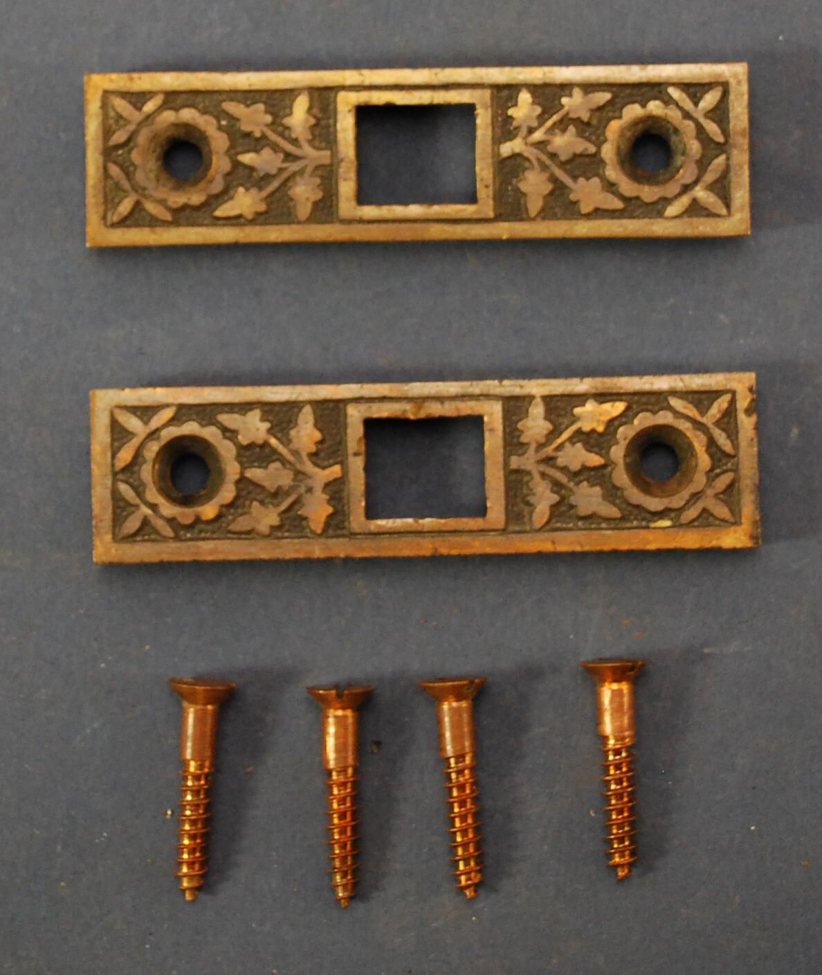 Design Name: Manufacturer: Unknown Style: Aesthetic Material: Bronze Manufacturing Method: Cast Surface Finish: VDA Classification: VDA Number: Shape: Patent Specifics: Lock Type (If Applicable): Inscription/Makers Mark: Inscription Text: Comments: Probably strikes for flush bolts or pocket door locks; includes four screws.