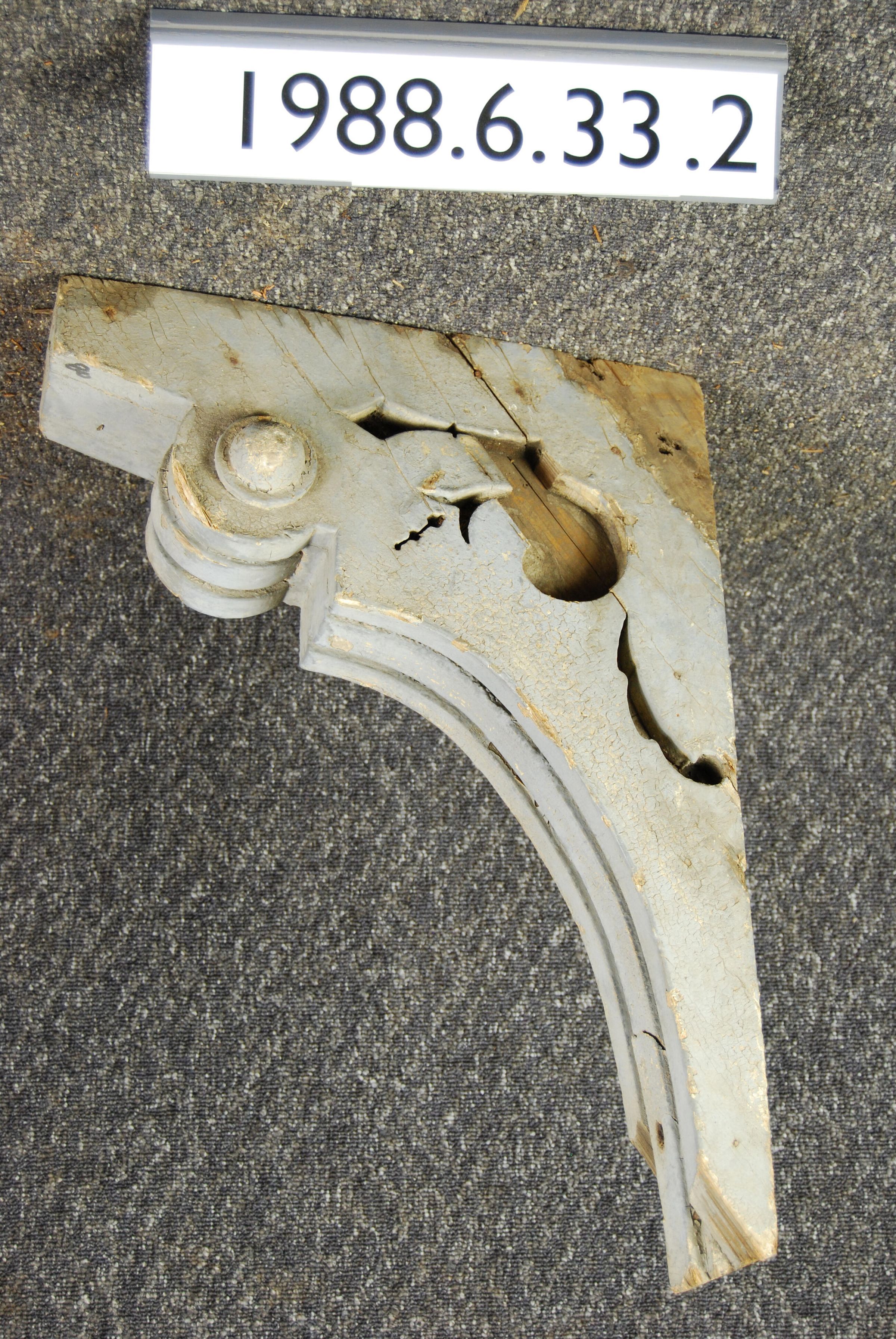 Wood bracket. Scrolled sides. (Missing pieces at sides). Fluted front. Painted grey. Inscriptions or Markings: Manufacturer: Place of Manufacturer: Design motif: Style: Finish: Painted