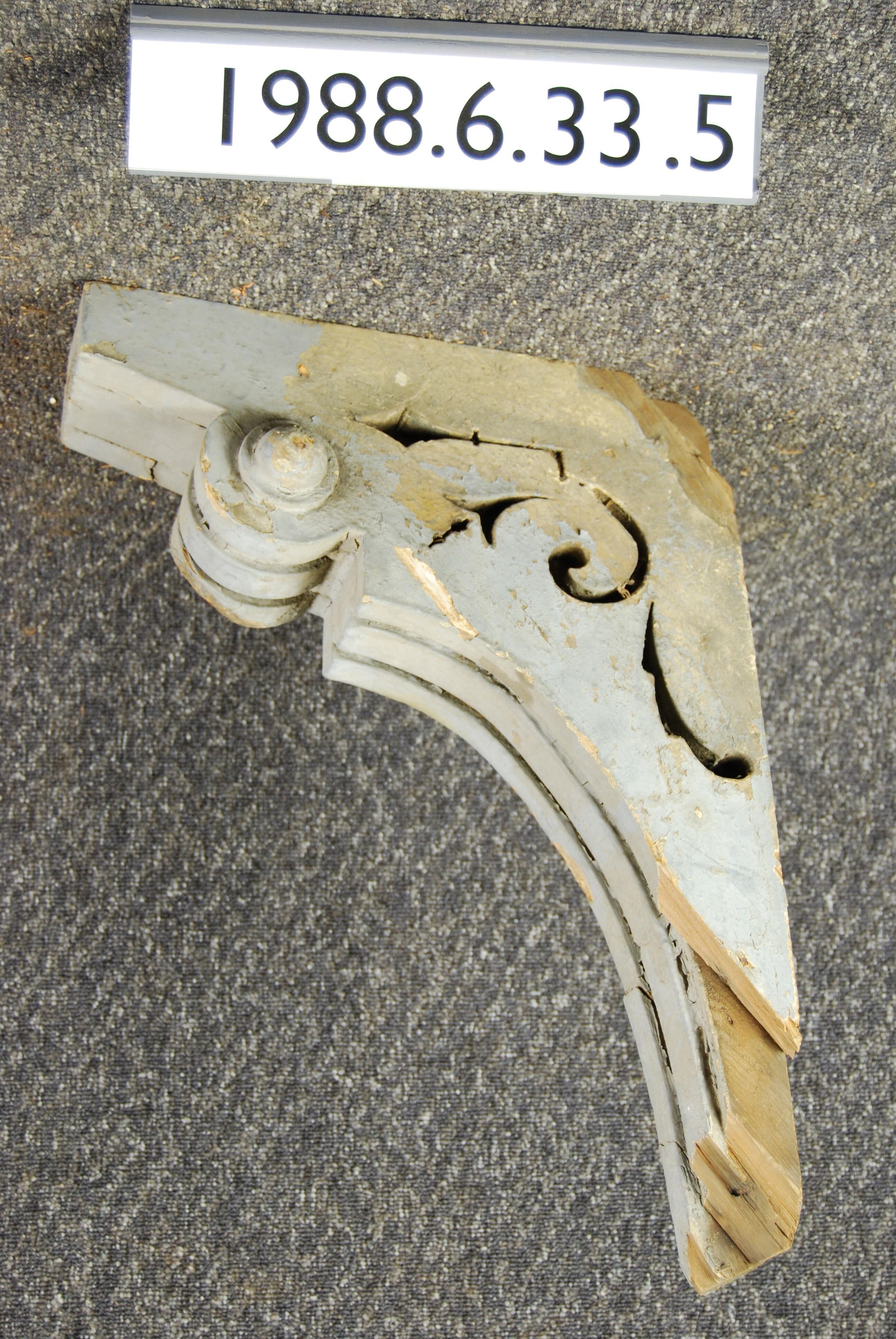 Wood bracket. Scrolled sides. Broken / missing pieces at back and bottom ends. Fluted front. Painted grey. Inscriptions or Markings: Manufacturer: Place of Manufacturer: Design motif: Style: Finish: Painted