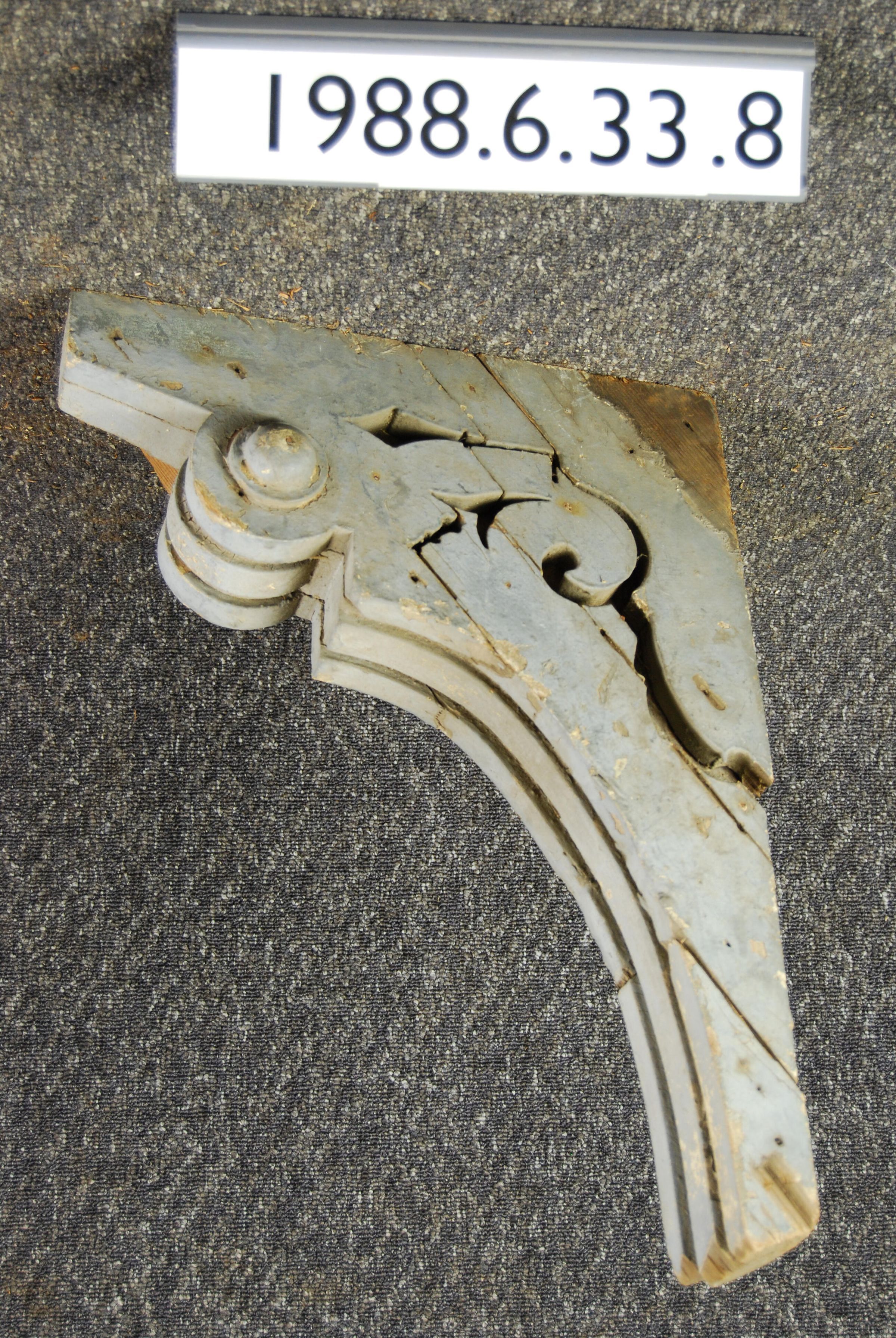 Wood bracket. Scrolled sides. Missing pieces at side and bottom end. Fluted front. Painted grey. Inscriptions or Markings: Manufacturer: Place of Manufacturer: Design motif: Style: Finish: Painted