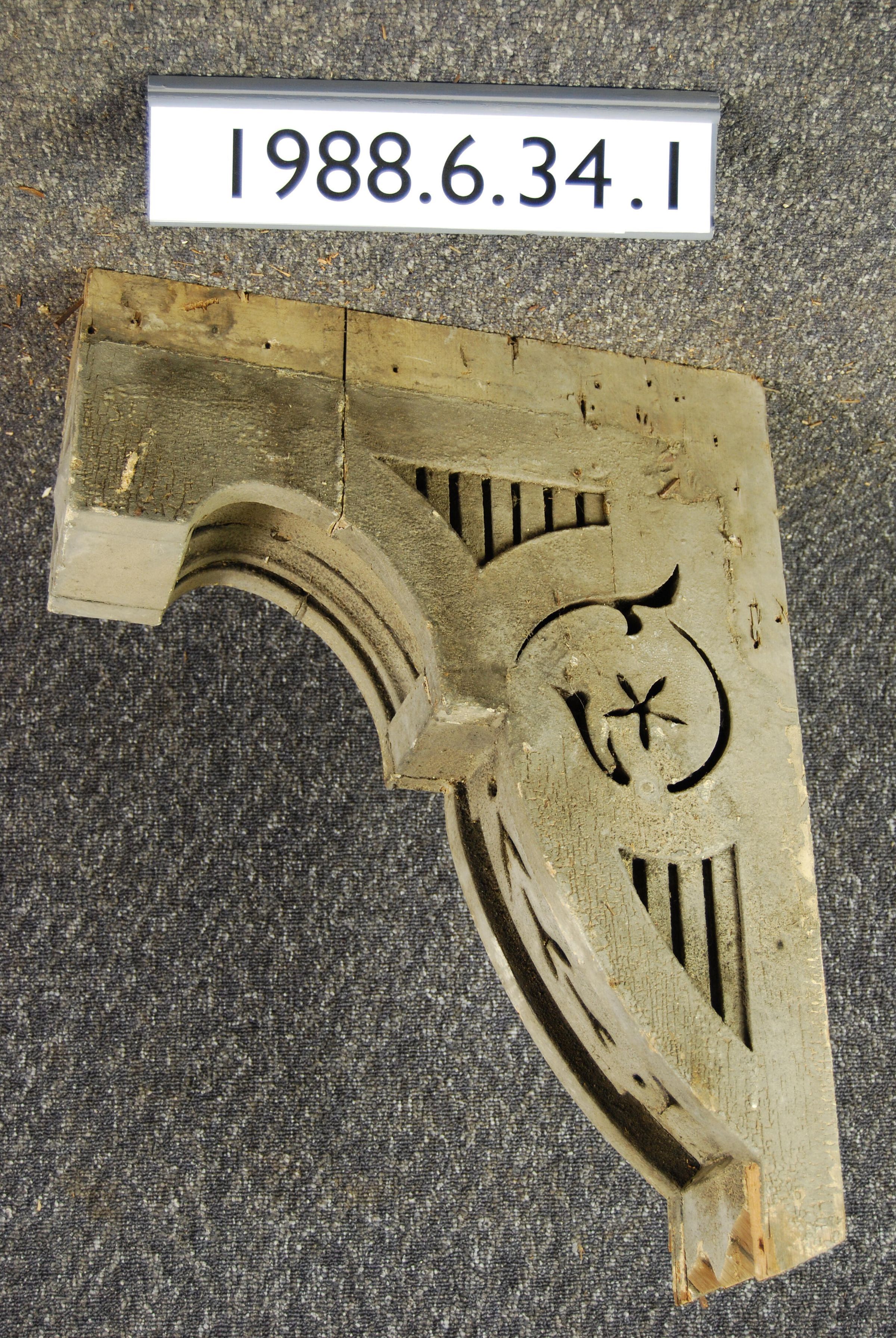 Wood cornice bracket. Scrolled sides. Recessed fluted panels at sides. Aesthetic movement ornamentation. Painted grey. Inscriptions or Markings: Manufacturer: Place of Manufacturer: Design motif: Style: Finish: Painted