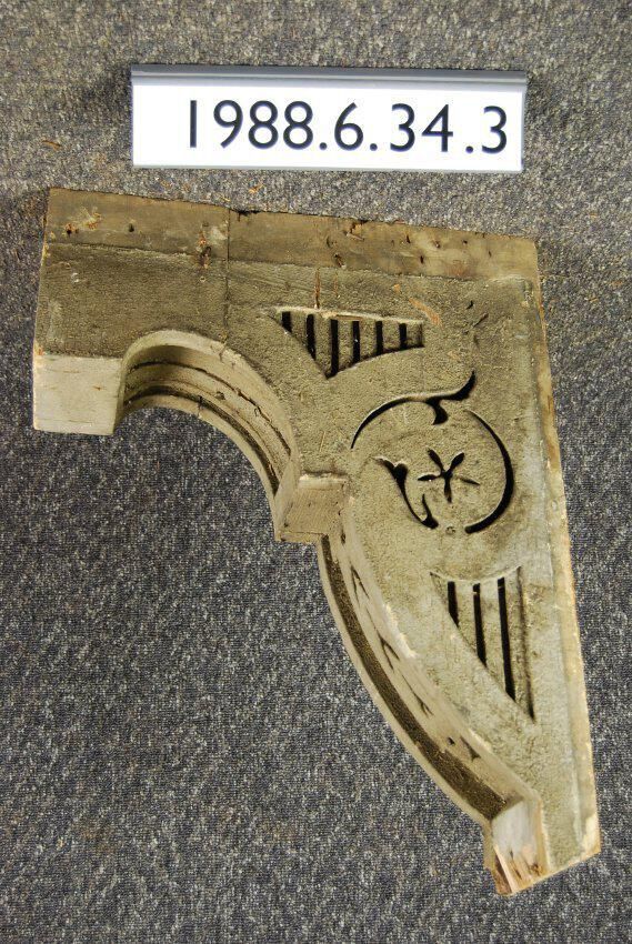 Wood cornice bracket. Scrolled sides. Recessed. Fluted panels at sides. Aesthetic movement ornamentation. Painted grey. Inscriptions or Markings: Manufacturer: Place of Manufacturer: Design motif: Style: Finish: Painted