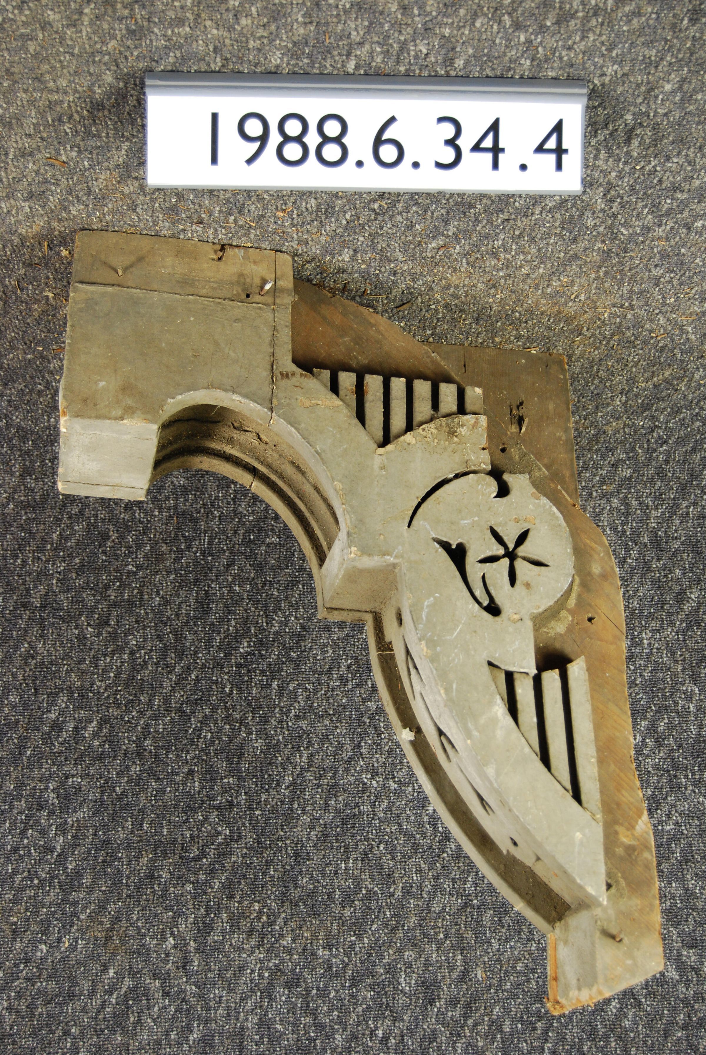 Wood cornice bracket. Scrolled sides. Recessed. Fluted panels at sides (missing parts). Aesthetic movement ornamentation. Painted grey. Inscriptions or Markings: Manufacturer: Place of Manufacturer: Design motif: Style: Finish: Painted