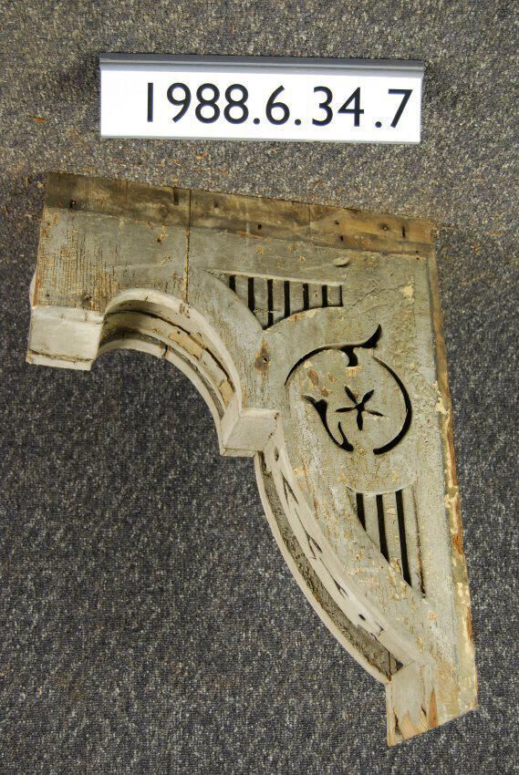 Wood cornice bracket. Scrolled sides. Recessed fluted panels at sides. Aesthetic movement ornamentation. Painted grey. Inscriptions or Markings: Manufacturer: Place of Manufacturer: Design motif: Style: Finish: Painted