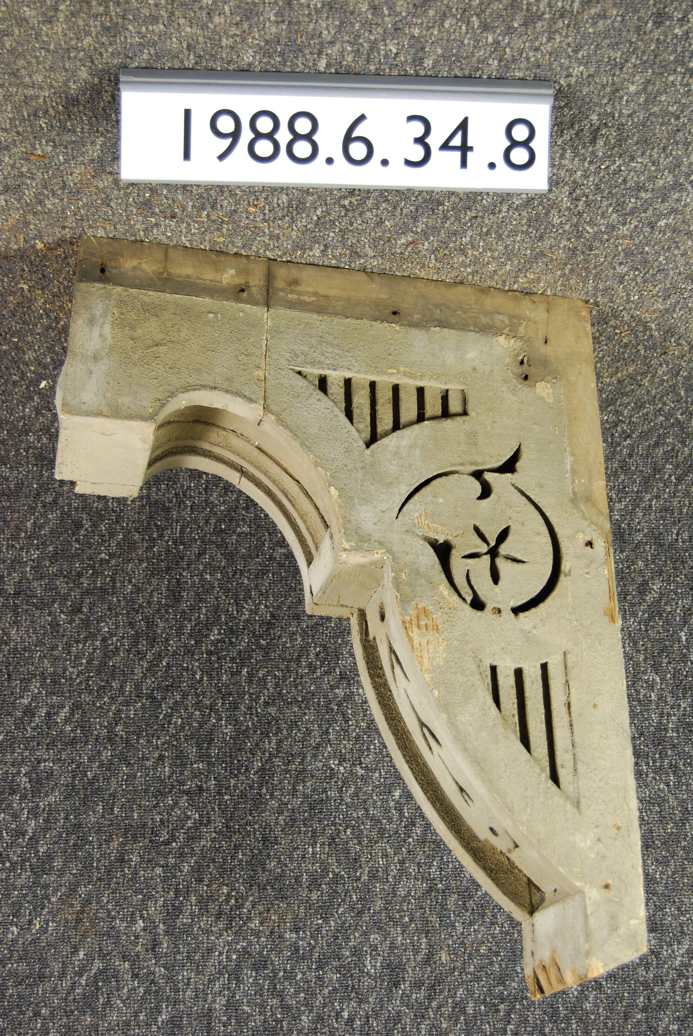 Wood cornice bracket. Scrolled sides. Recessed fluted panels at sides. Aesthetic movement ornamentation. Painted grey. Inscriptions or Markings: Manufacturer: Place of Manufacturer: Design motif: Style: Finish: Painted