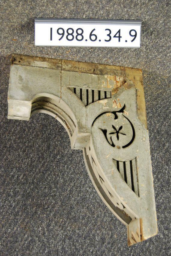 Wood cornice bracket. Scrolled sides. Recessed fluted panels at sides. Aesthetic movement ornamentation. Painted grey. Inscriptions or Markings: Manufacturer: Place of Manufacturer: Design motif: Style: Finish: Painted