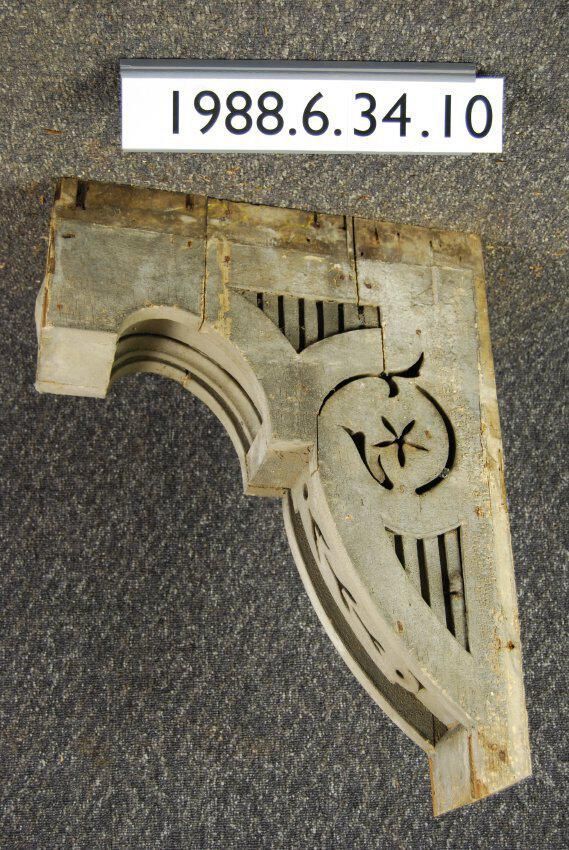 Wood cornice bracket. Scrolled sides. Recessed fluted panels at sides. Aesthetic movement ornamentation. Painted grey. Inscriptions or Markings: Manufacturer: Place of Manufacturer: Design motif: Style: Finish: Painted