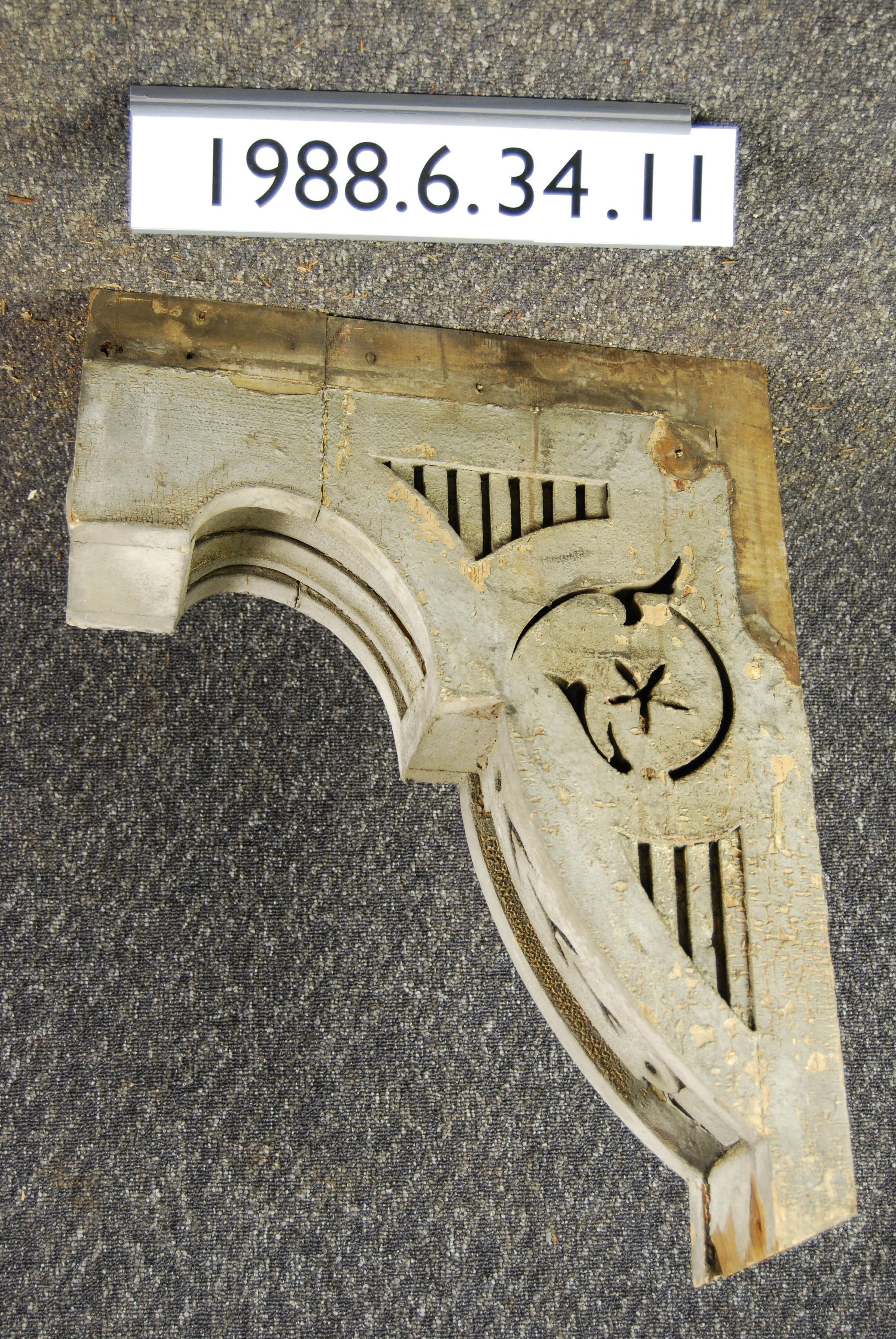 Wood cornice bracket. Scrolled sides. Recessed fluted panels at sides. Aesthetic movement ornamentation. Painted grey. Inscriptions or Markings: Manufacturer: Place of Manufacturer: Design motif: Style: Finish: Painted