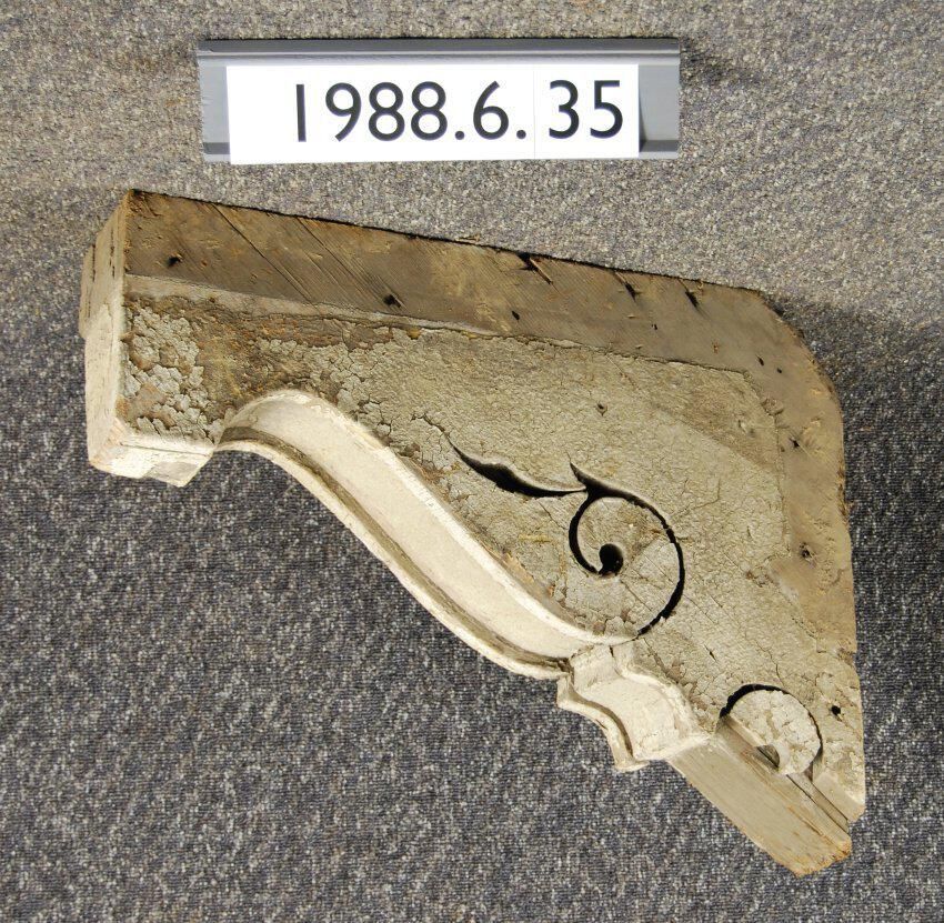 Wood cornice bracket. Scrolled sides. Some pieces missing. Painted. Inscriptions or Markings: Manufacturer: Place of Manufacturer: Design motif: Style: Finish: Painted