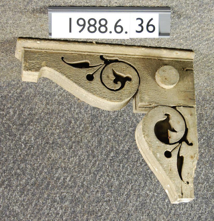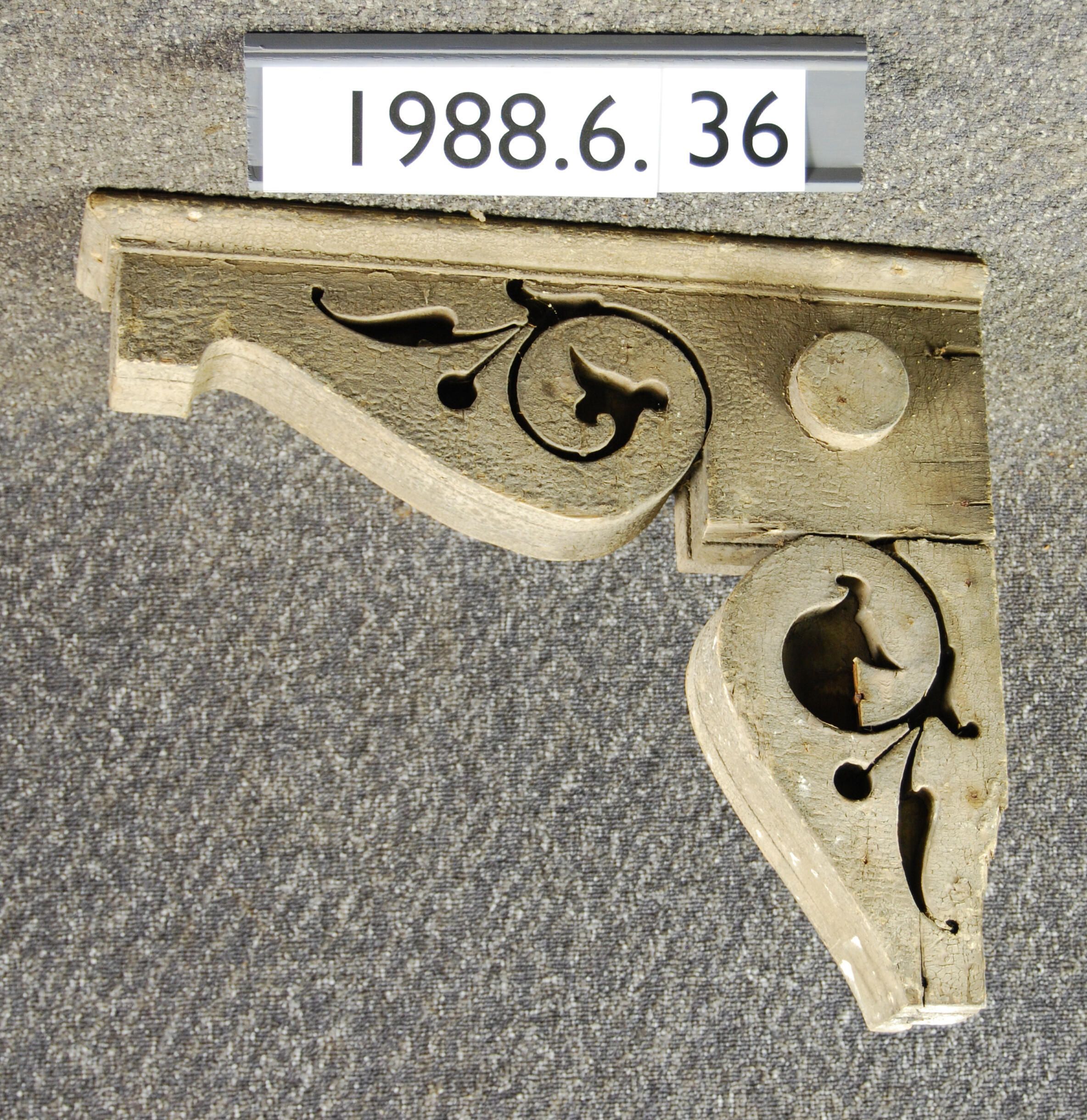Wood cornice bracket. Scrolled sides. Ornamental disc on each respective side. Painted grey. Inscriptions or Markings: Manufacturer: Place of Manufacturer: Design motif: Style: Finish: Painted