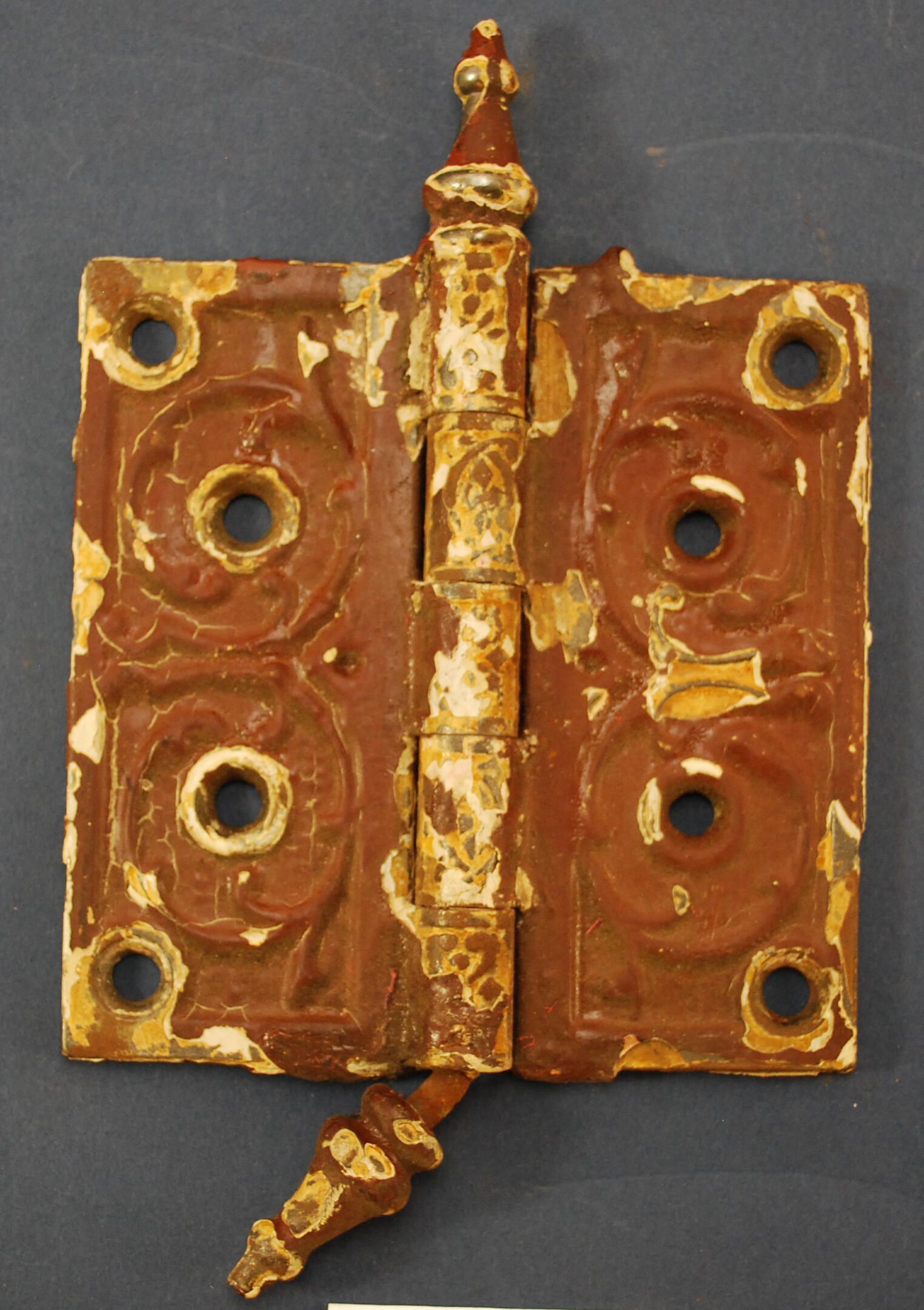 Design Name: Manufacturer: Unknown Style: Neo-Grec Material: Iron Manufacturing Method: Cast Surface Finish: Painted VDA Classification: VDA Number: Shape: Patent Specifics: Lock Type (If Applicable): Inscription/Makers Mark: Inscription Text: 4.5 x 4.5 Comments: Fixed joint, steeple tip, same pattern as 1988.3.1556. Bent hinge pin.