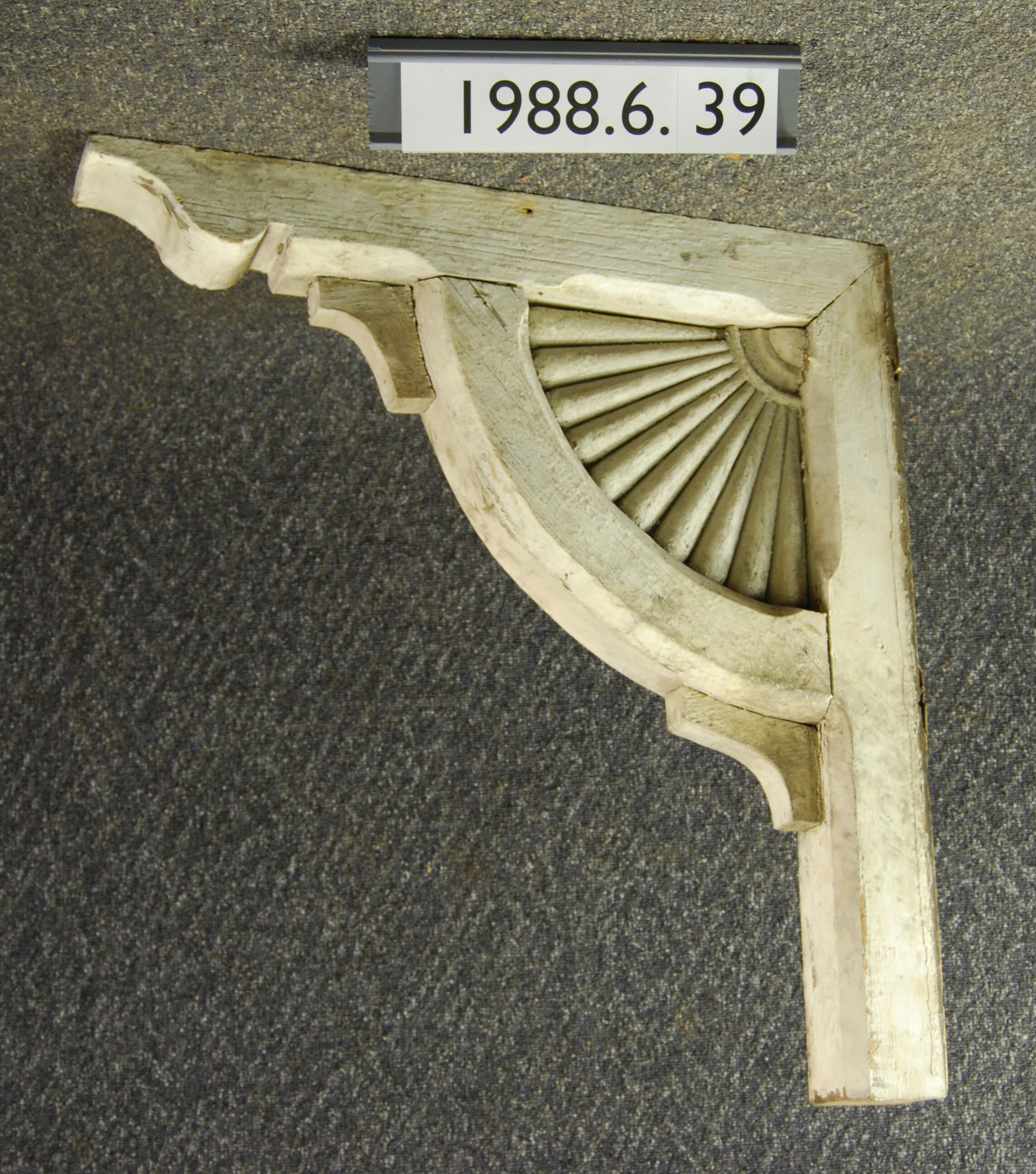 Wood bracket. Semi-circular sunburst ornament within right angle frame. Painted white. Inscriptions or Markings: Manufacturer: Place of Manufacturer: Design motif: Style: Finish: Painted