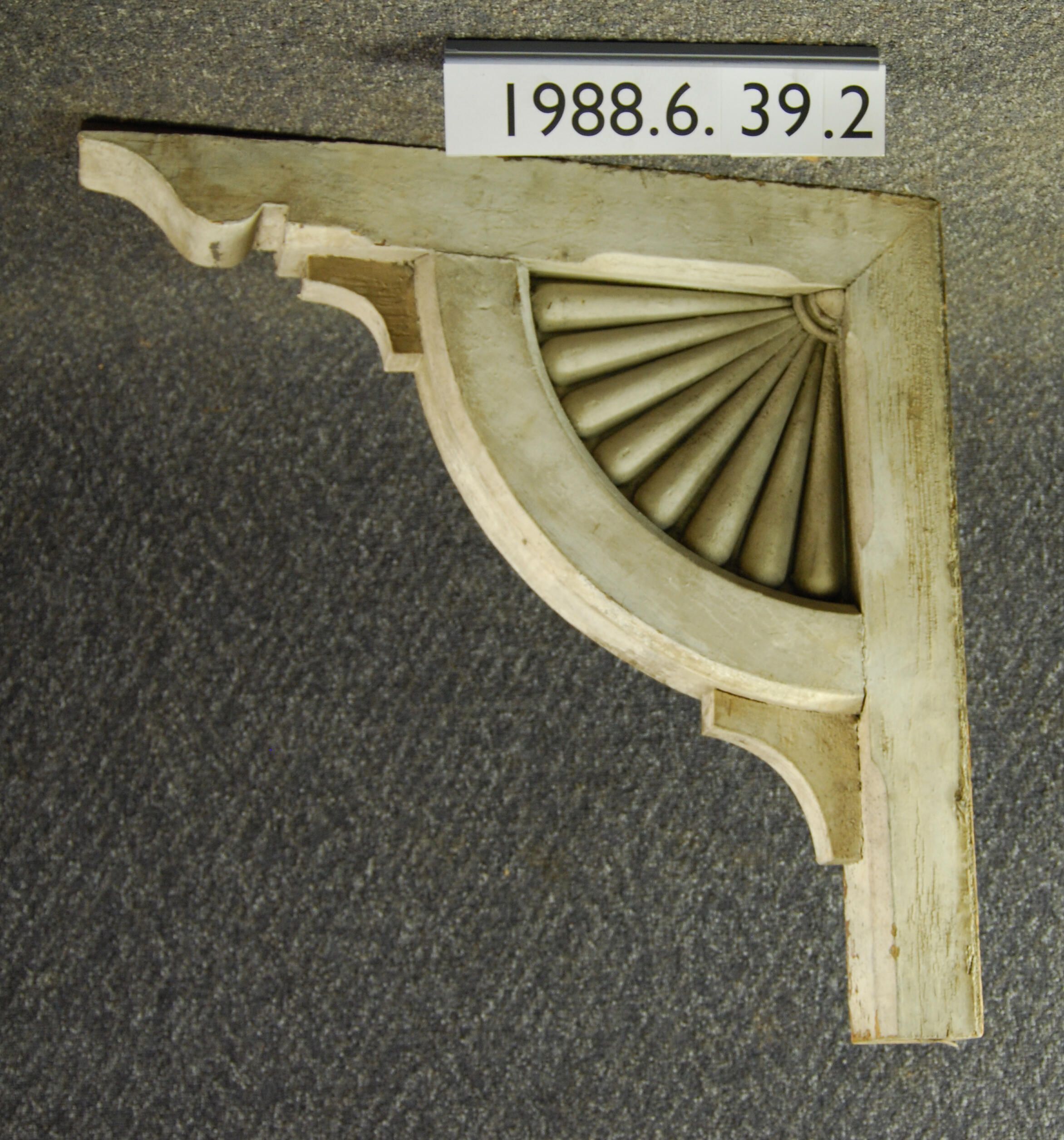 Wood bracket. Semi-circular sunburst ornament within right angle frame. Painted white. Inscriptions or Markings: Manufacturer: Place of Manufacturer: Design motif: Style: Finish: Painted