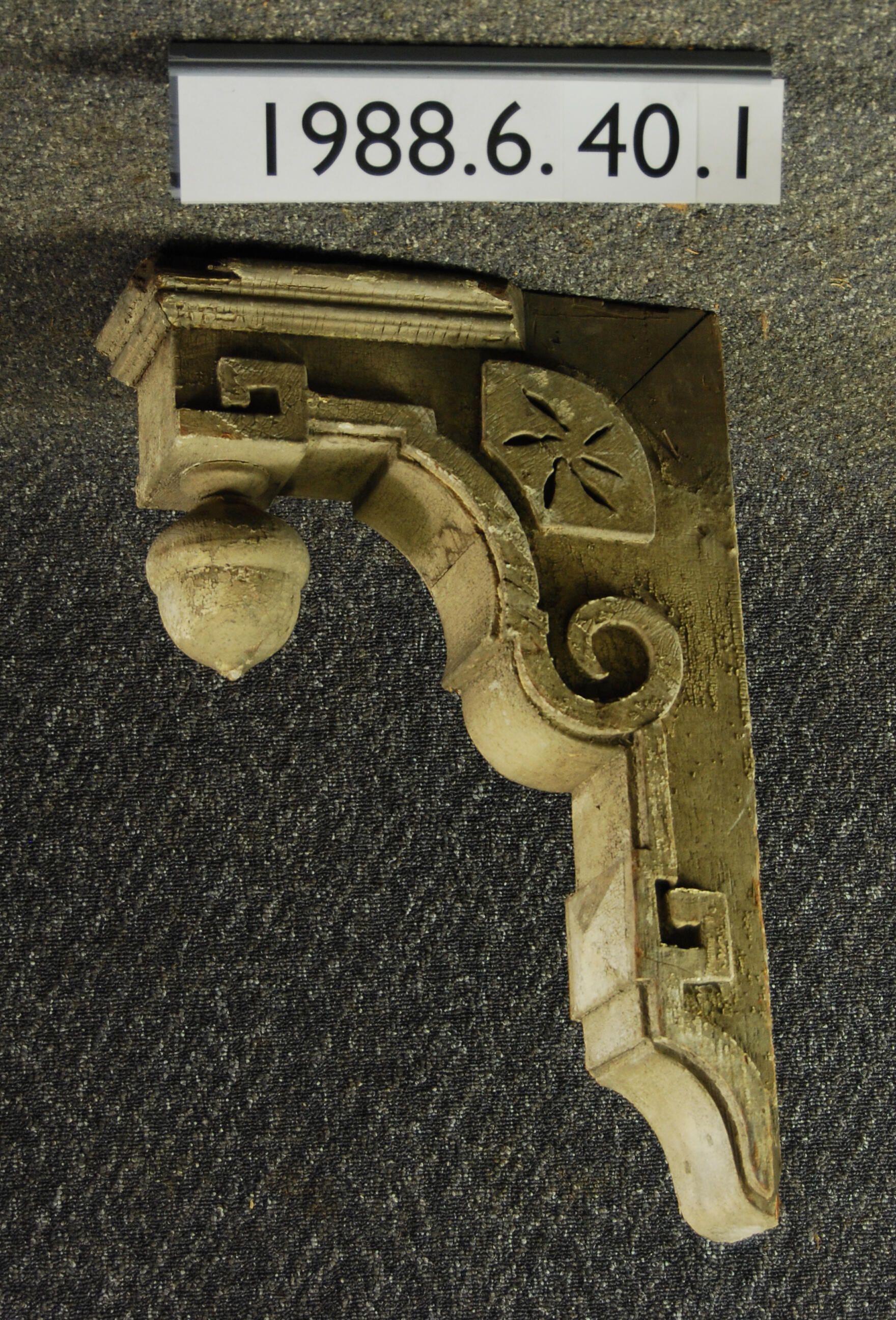 Wood bracket. Scrolled sides. Greek key ornaments on each side. Has acorn drop ornament. Painted yellow. Inscriptions or Markings: Manufacturer: Place of Manufacturer: Design motif: Style: Finish: Painted