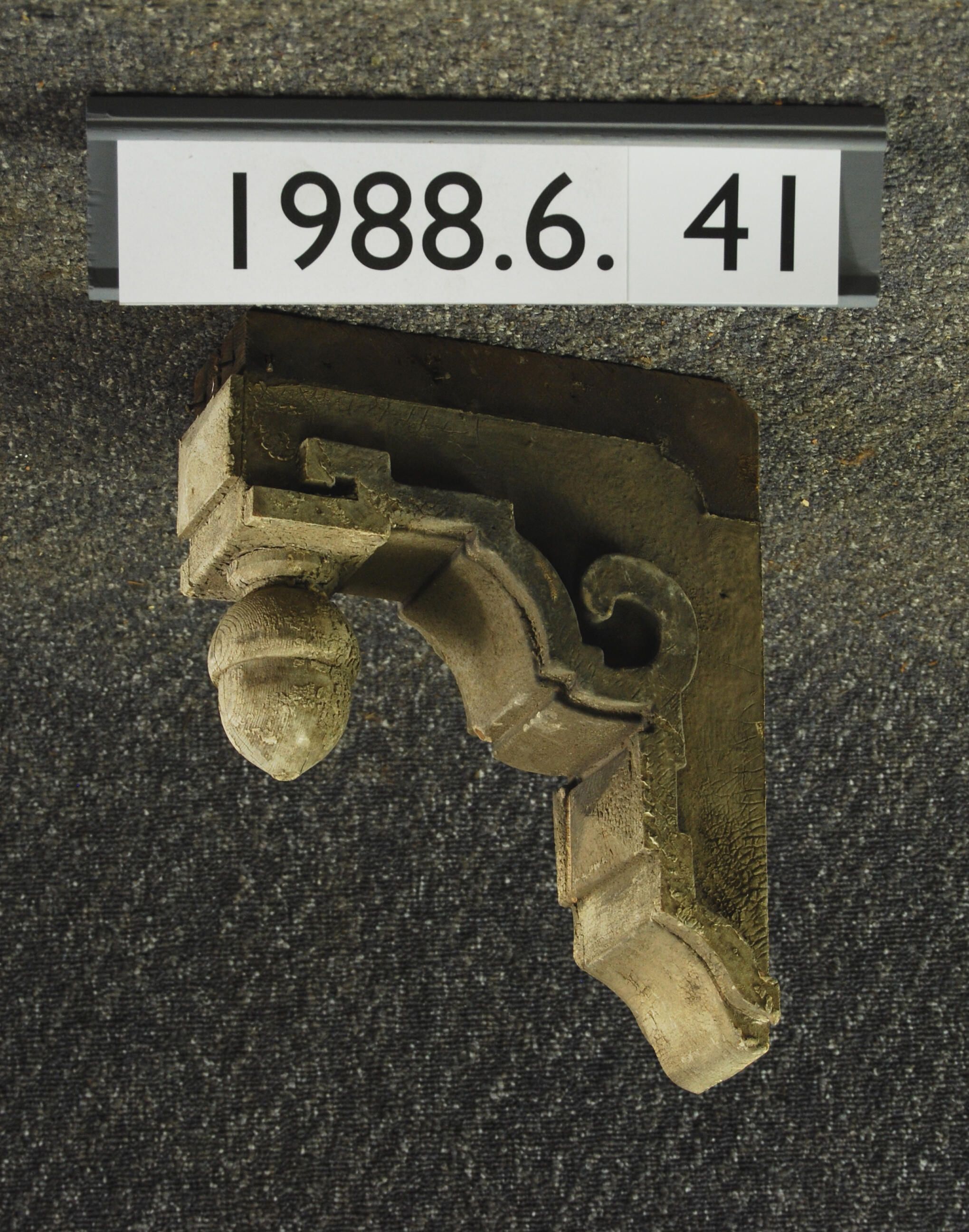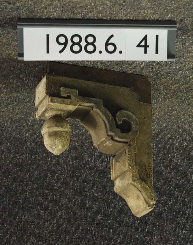Wood bracket. Scrolled sides. Greek key ornament on each side. Acorn drop ornament . Painted yellow. Inscriptions or Markings: Manufacturer: Place of Manufacturer: Design motif: Style: Finish: Painted